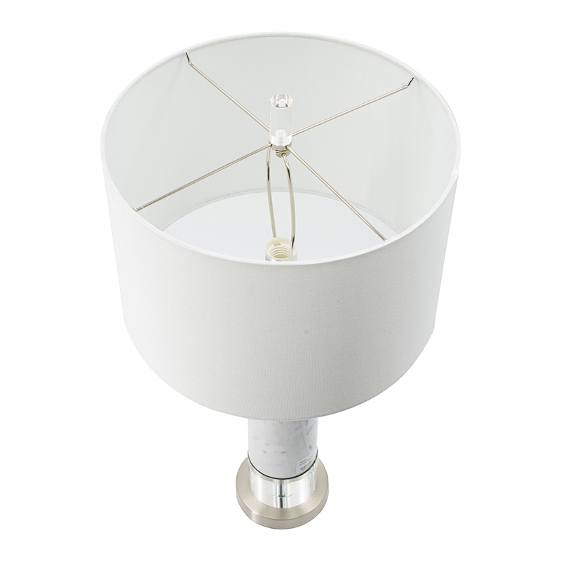This single marble and acrylic table lamp uses a set of cylinders to create a lightweight modern profile. By using a white marble piece with a clear accent and round base, this lamp takes simple forms and gives them an elegant new direction, one that attracts the eye and enhances decor. Add its white drum shade and you have the ideal look for living rooms, bedrooms, and more.