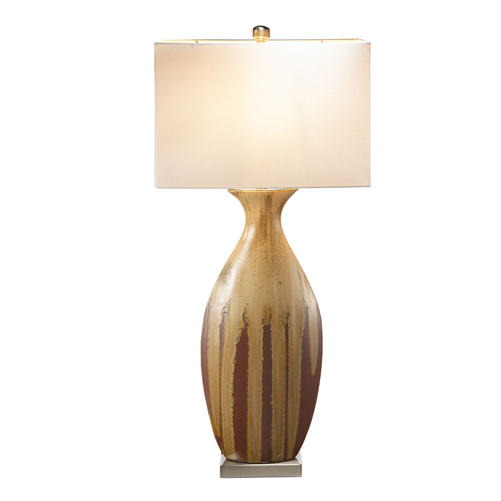 Featuring an intriguing multicolored drip glaze finish on its ceramic base and a contrasting ivory fabric shade, this table lamp can accentuate an office desk, bedroom dresser, or dining room buffet.