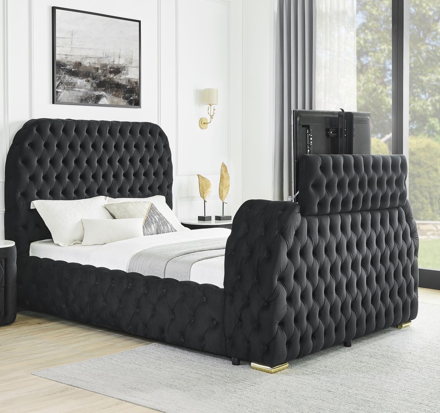 Indulge in the epitome of luxurious comfort and innovative design with this exquisite bed, a true masterpiece for those who appreciate both form and functionality in their sleeping quarters. Boasting a majestic, deeply tufted headboard that extends all the way to the edges, this bed is upholstered in sumptuous black velvet, offering a touch of opulence to any bedroom setting. The footboard features an integrated television lift mechanism, seamlessly blending entertainment with relaxation. Additionally, a built-in electric fireplace enhances the ambiance and provides a cozy, warm glow that invites you to unwind in style. The design is completed with subtle gold accents on the feet, adding a dash of elegance. This bed is perfect for those seeking a luxurious retreat that combines modern technology with sophisticated design elements to create an unparalleled bedroom experience.