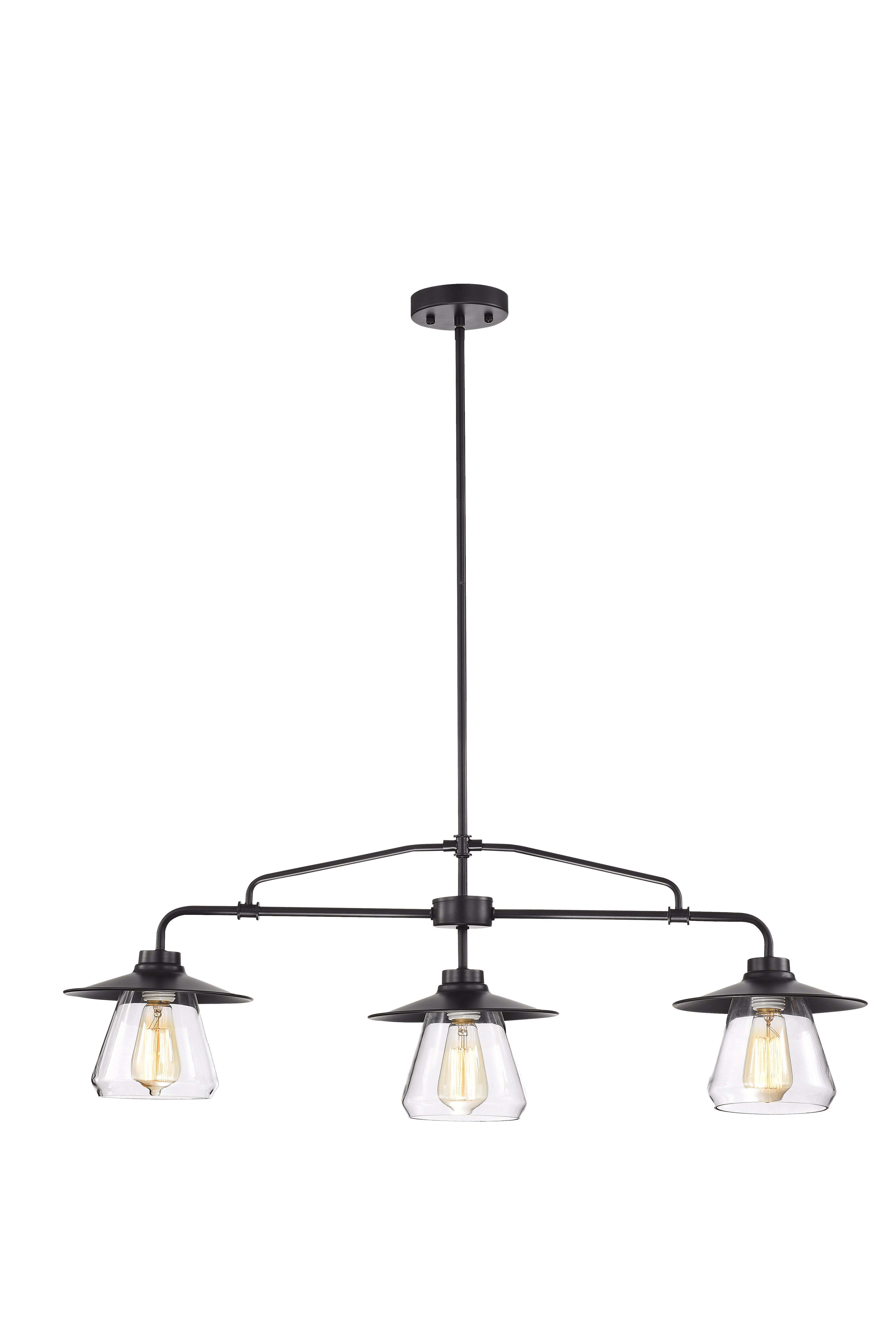 This full piped downrod metal chandelier with three hooded glass lamps is a fantastic addition to any home. Great character with the included Edison Style light bulbs. Perfect in an industrial designed space over a long counter or dining table.