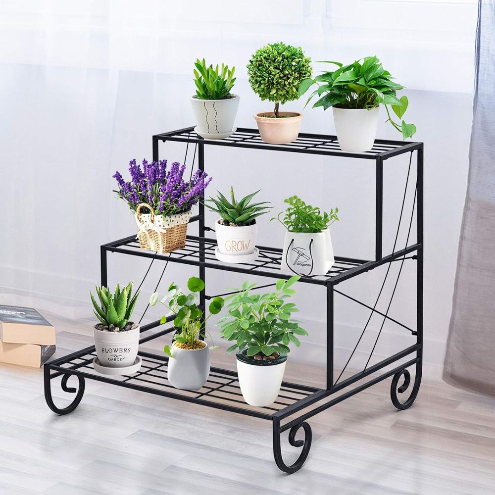 -Comes with 3 flat metal shelves that are made in a step design to display your plants in an appealing and interesting fashion