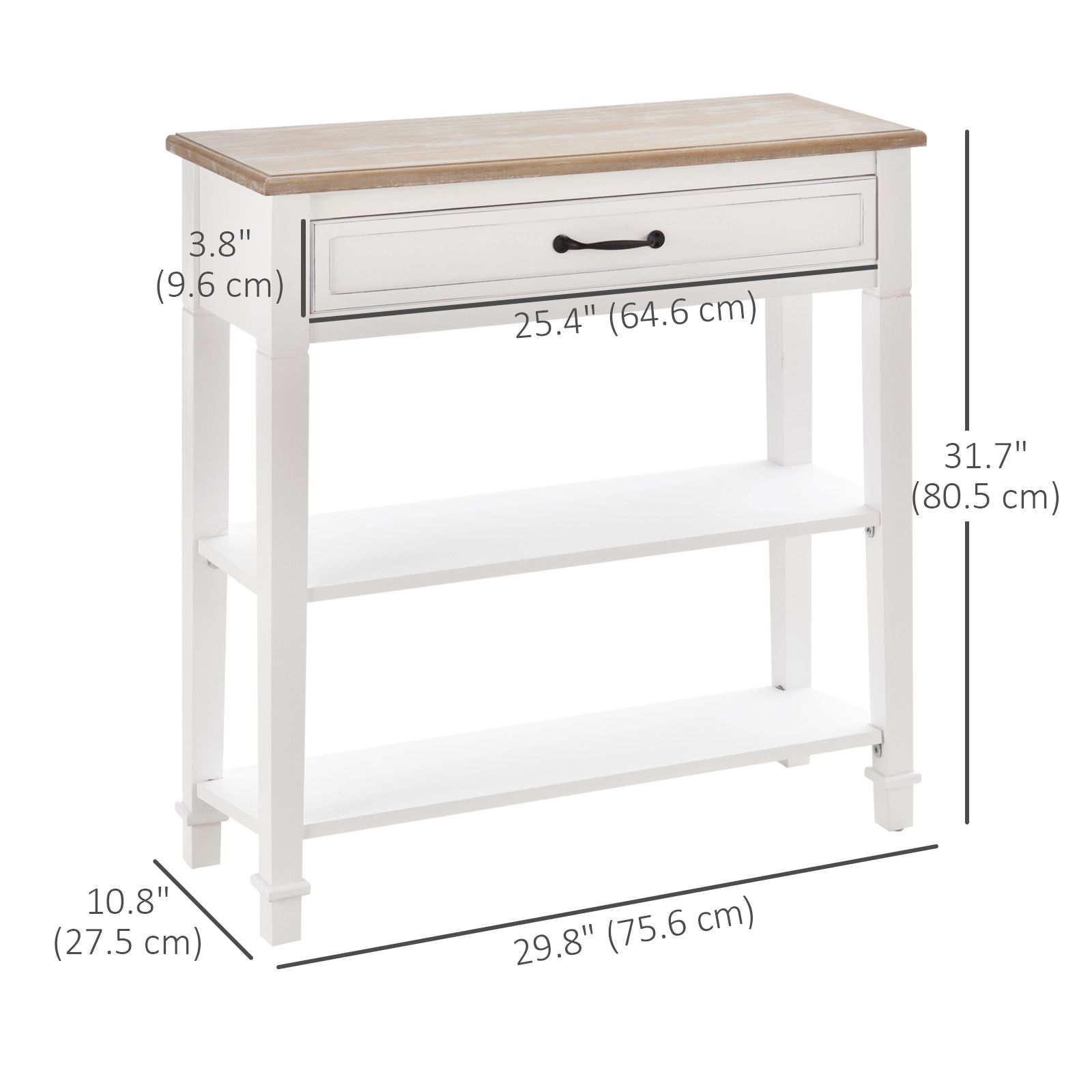 • Entry Table Information: Overall Dimensions: 29.8" W x 10.8" D x 31.7" H (75.6 x 27.5 x 80.5 cm). Weight Capacity: 33 lbs/15kg (Whole), 22 lbs/10kg (Panel), 11 lbs/5kg (Drawer). Assembly Required.