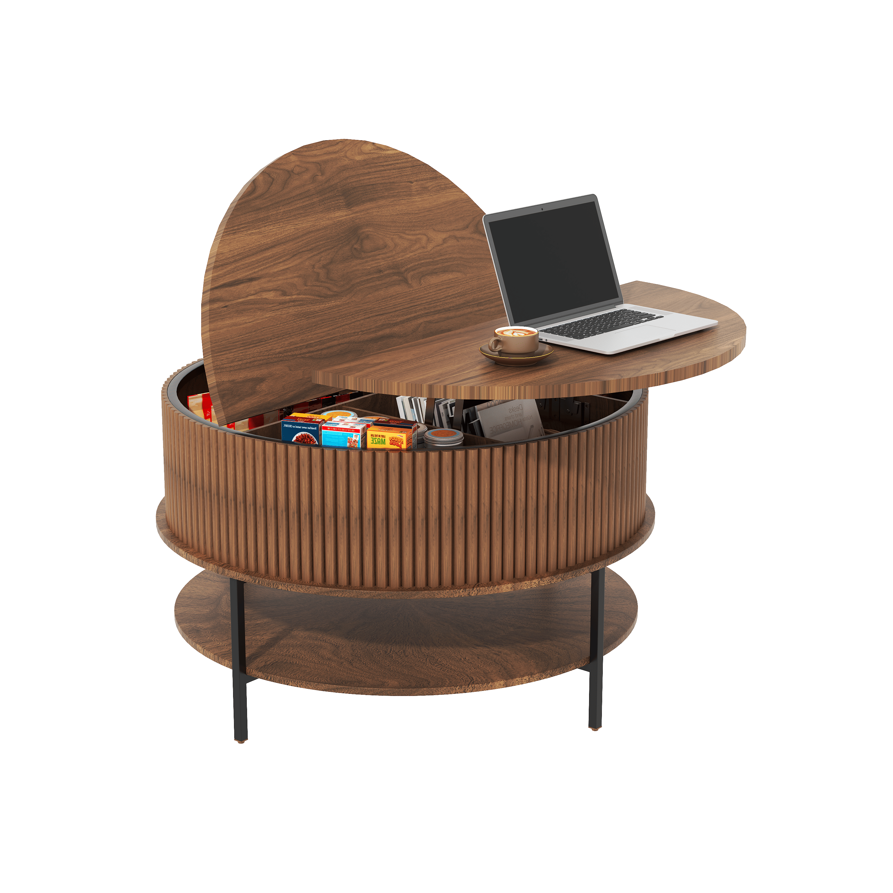A Centerpiece for Connected LivingPicture the heart of your home: a space that is both beautifully styled and intelligently organized. Our 31.5-inch round coffee table is designed to be the centerpiece of this vision. It masterfully blends the warm, inviting character of farmhouse style with innovative functionality, offering a solution that adapts to your every need-from a busy family game night to a focused work-from-home session.Designed for Modern LifeWe created this table for those who believe their furniture should work as hard as they do, without compromising on style or safety.Your Command Central: Experience the joy of a clutter-free living room. The effortless lift-top mechanism reveals a generous hidden space to tuck away daily clutter in a single motion. When raised, it becomes your perfect partner for a laptop workstation, a elevated dining surface for cozy movie nights, or a stable platform for creative projects.Peace of Mind in Every Curve: We prioritized your family's well-being. The signature round design isn't just a style choice-it's a safety promise, creating a soft-edged environment safe for playful children and roaming pets. Anchored by a rock-solid base of reinforced steel legs and non-slip pads, this table offers unwavering stability you can count on.Style That Tells a Story: More than just furniture, this table is an expression of your taste. The rich brown wood grain finish captures the timeless, rustic elegance of farmhouse charm, designed to tell a story of warmth and welcome in your home. Its versatile aesthetic ensures it complements a wide range of decor styles, making it a lasting piece you'll love for years to come.Your Invitation to an Organized, Stylish HomeWe invite you to experience the difference that thoughtful design can make. This isn't just another coffee table; it's an investment in a more functional, safe, and beautiful living space. With all tools and clear instructions included for a hassle-free setup, your new favorite piece of furniture is