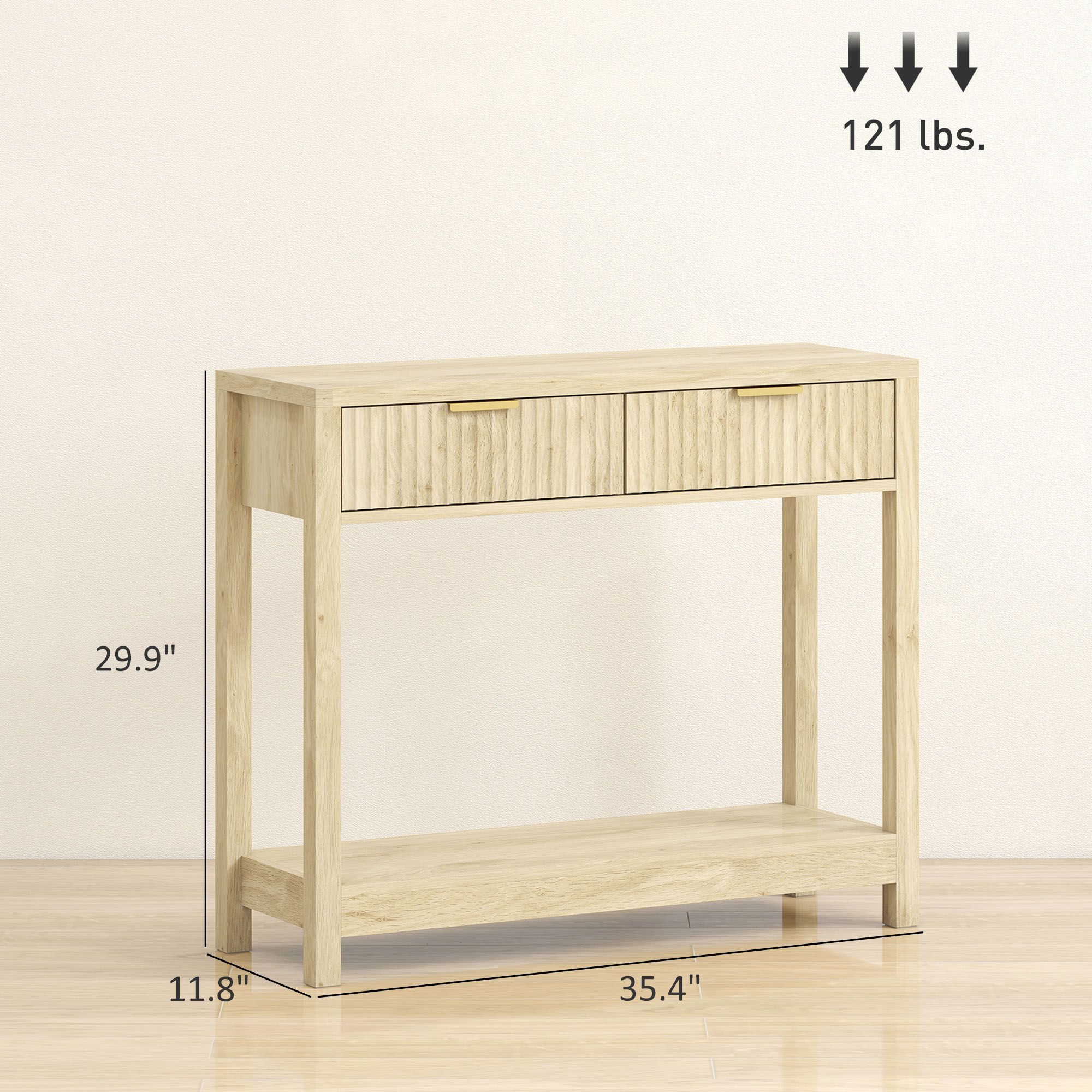 Discover the charm of the HOMCOM console table with drawers, where modern style meets functionality. Its fluted panel drawers and sleek design add a decorative touch to any entryway. Enjoy the convenience of two drawers and an open shelf to keep your space tidy. At the same time, the anti-tip kit ensures safety. Stylish, versatile, and space-saving—suitable as an entry table, sofa table, or hallway accent.
