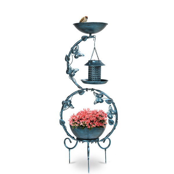 Enhance your garden with this beautifully designed 3-in-1 Bird Bath with Solar Feeder and Planter. Crafted from high-grade metal with anti-rust treatment, this multifunctional piece is designed to withstand the elements and bring charm to your outdoor space all year round. Combining a birdbath, solar-powered bird feeder, and a flower planter pedestal, it attracts birds by day and illuminates your garden by night. Adorned with a butterfly and intricate hollow patterns, it's not just a functional addition but also a stunning decorative piece for your garden or yard.