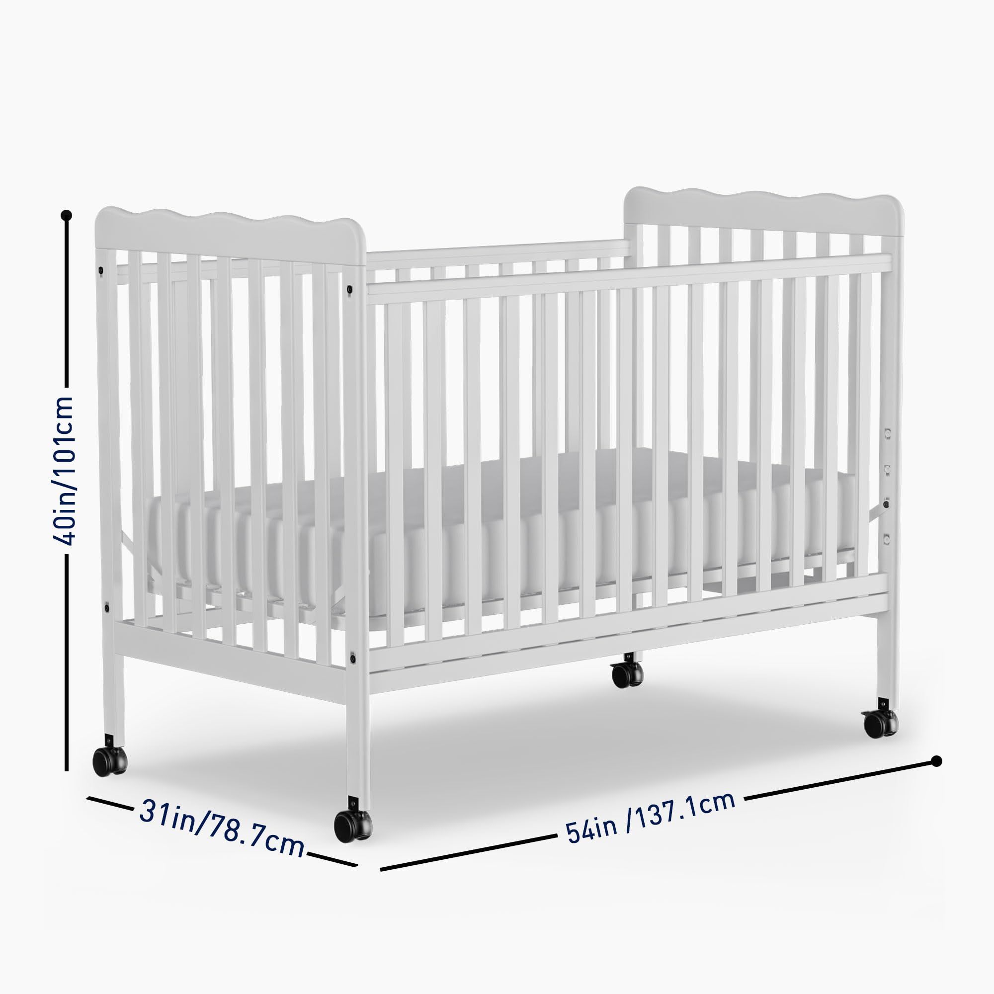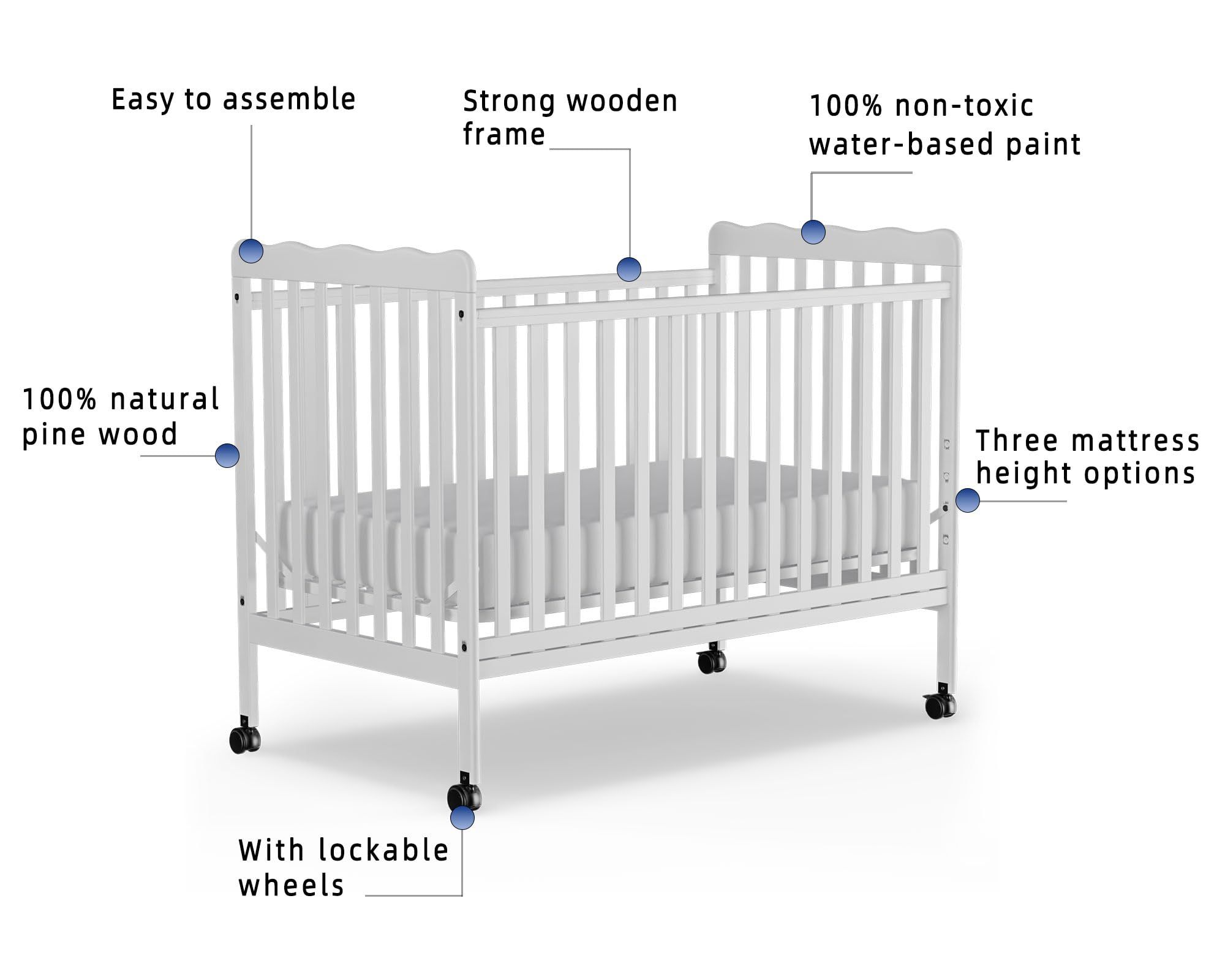 Three adjustable mattress height positions adapt to your baby’s growth: the highest setting lets you easily lift a newborn without straining, the middle position secures a sitting baby from climbing out, and the lowest setting suits active toddlers as they transition to independent sleep.