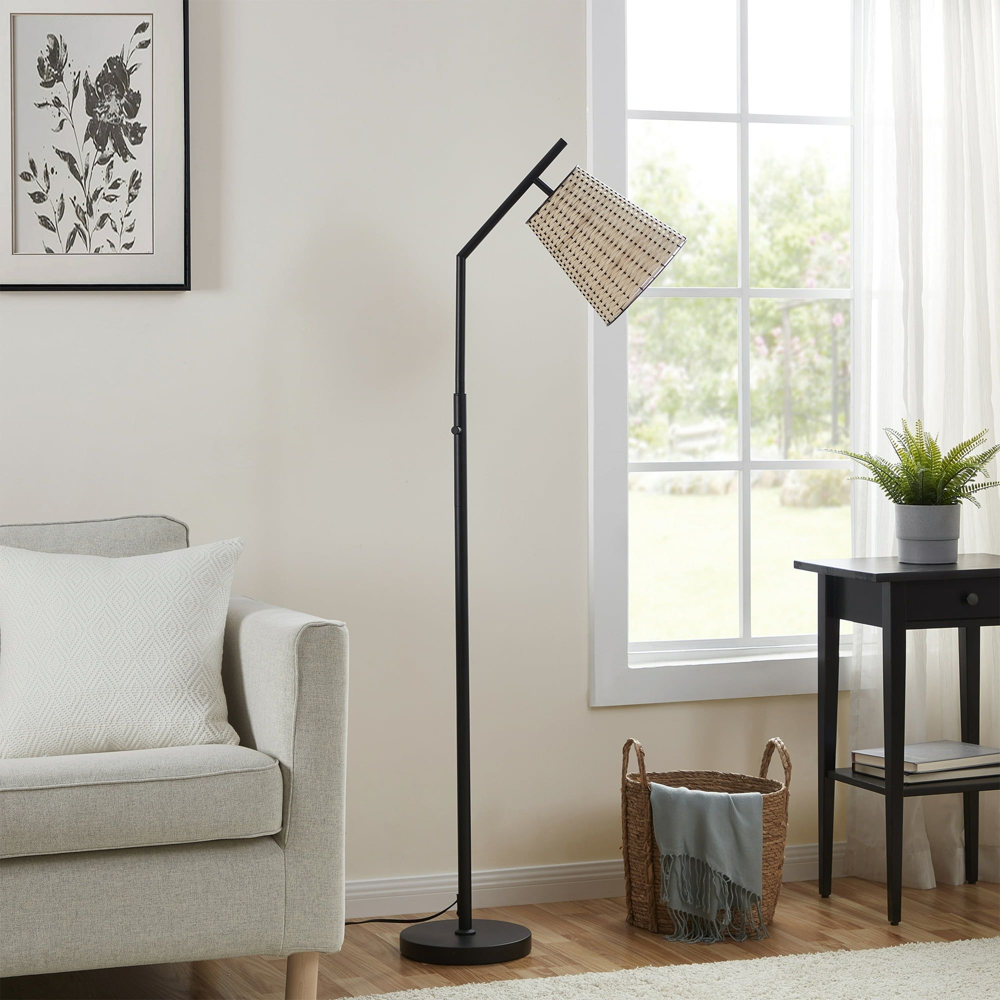 Boho Aesthetic: This standing floor lamp features a stylish rattan shade and a natural textured design, creating a relaxed, laidback boho aesthetic suitable for various room styles.Angled Design: The lamp boasts a unique angled design, enhancing modern decor and serving as an eye-catching lighting accent in any space.Stable Construction: A sturdy, weighted round metal base ensures the lamp's stability, making it a reliable addition to your living room, bedroom, or office.Generous Dimensions: The overall lamp height is 60 inches, providing ample illumination, while the shade has a diameter of 9 inches.Versatile Placement: Ideal for a living room, bedroom, kids' room, office, dorm room, or reading nook, this lamp offers versatile lighting solutions.