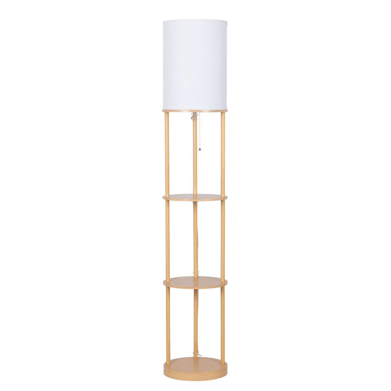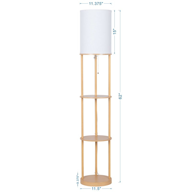 62" Brown Oval Wood Finish Shelf Floor Lamp with Hardback KD Shade farmhouse design will enhance your living space's dcor. It is equipped with 3 built-in shelves for storage which can easily hold books, knick knacks or other small items you want to display. Assembly is required. Light up your room with this Brown Oval Wood Shelf Floor Lamp.62 in Farmhouse Light Wood Floor Lamp* Stylish farmhouse design with a light wood finish* Height of 62 inches, perfect for various room settings* Shade dimensions: 11.375 x 9.25 x 15 inches* Features three built-in shelves for convenient storage* Each shelf has a weight limit of 1 to 2 pounds* Easy on/off pull chain switch for simple operation* Assembly required for setup