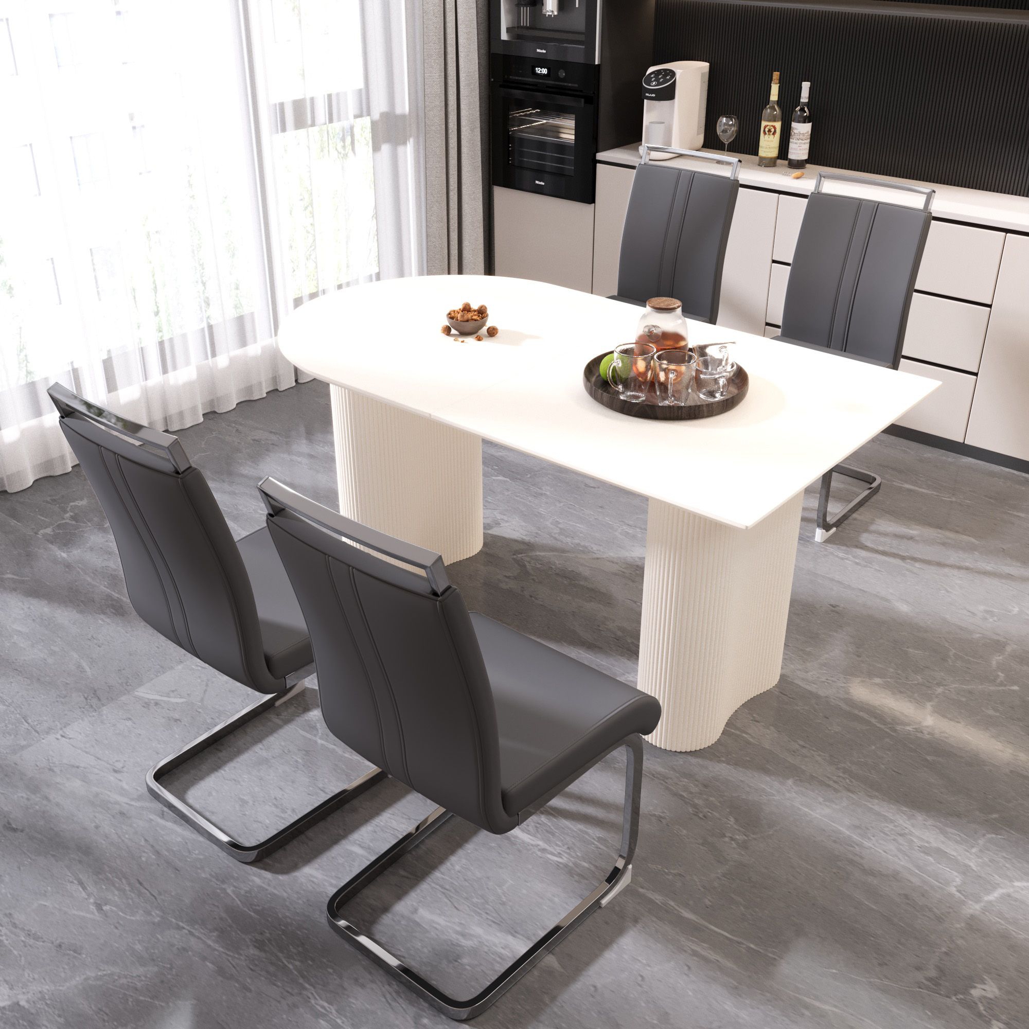 1.5-piece dining table and chair set: A table that can accommodate 4-8 guests for gatherings and four ergonomically designed leather modern style armless dining chairs, creating a fashionable focus for you in the dining area.