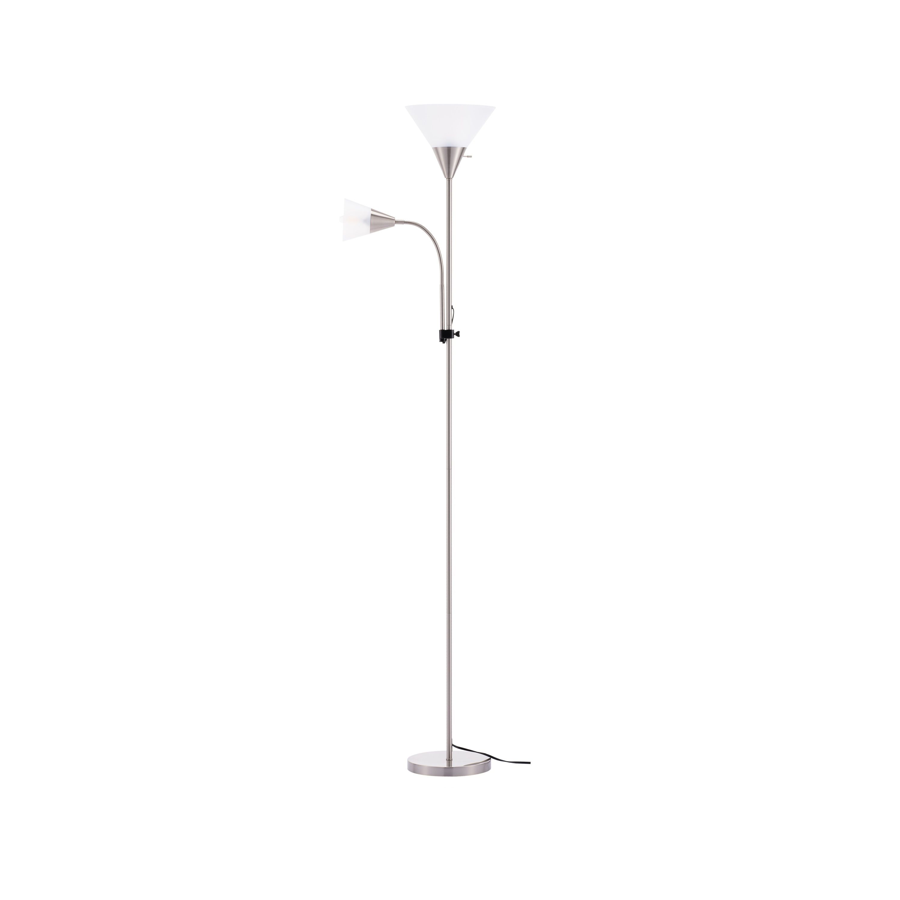 - Main lamp on top and a side reading light design, with rosted white arcylic cone lampshades.