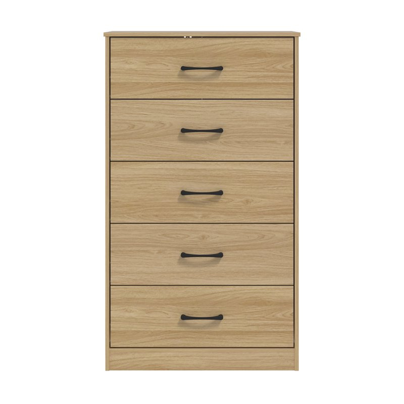 This five-drawer dresser is as simple to put together as it is sleek. Featuring a design that allows for quick and easy assembly by anyone, this piece gives you an elevated look without the hard work. Grooved Wood Compositeen panels are designed to stay in place so you can effortlessly snap them together and then move on with your day. With clean lines and a timeless silhouette, this adult dresser boasts generously sized drawer pulls, and a lamination process ensures a consistent euro oak finish throughout. Tall and lean, this dresser features five spacious drawers that slide smoothly on a metal glide system. Add understated elegance to your bedroom with this casual transitional piece. Assembly required.* Minimally adorned casual transitional adult dresser with a classic silhouette* Wood Composite, MDF, particle board and PU paper foil laminate construction in a euro oak finish* Ultra-fast, frustration-free, easy assembly* Overall Dimensions: 47.75H x 27.75W x 16.5D* Assembly required* Item will ship in one box* Effortless metal glide system* This product is compliant with the U.S. STURDY Act, which addresses anti-tip specifications that protect children. The design prohibits multiple drawers from being opened at once for safety purposes, and anti-tip hardware is included in the package* Works well with modern and contemporary décor* Contrasting matte black drawer pulls