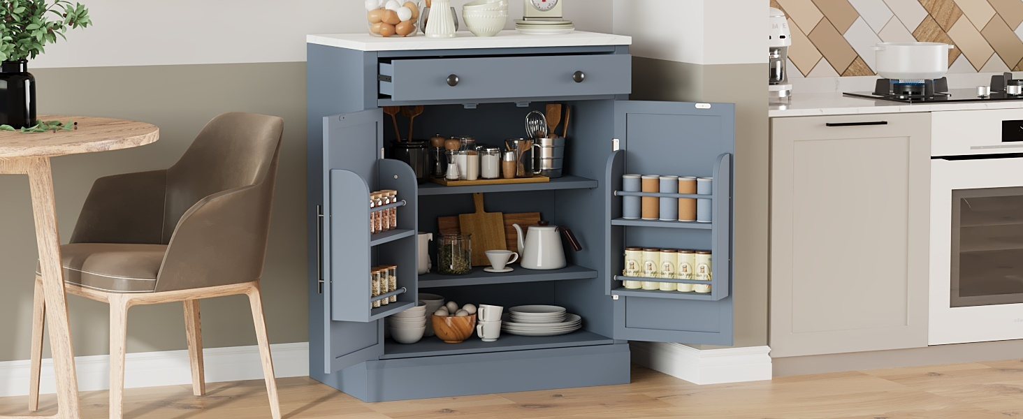 [Ample Storage and Organization]Maximize your storage space with a well-thought-out design featuring 2 adjustable shelves and 2 door shelves for versatile organization. The spacious pull-out drawer offers a convenient spot for utensils, napkins, or small accessories, ensuring a clutter-free and tidy kitchen. Whether storing dishes, pantry essentials, or coffee supplies, this cabinet keeps everything within easy reach while maintaining a clean, organized appearance.
