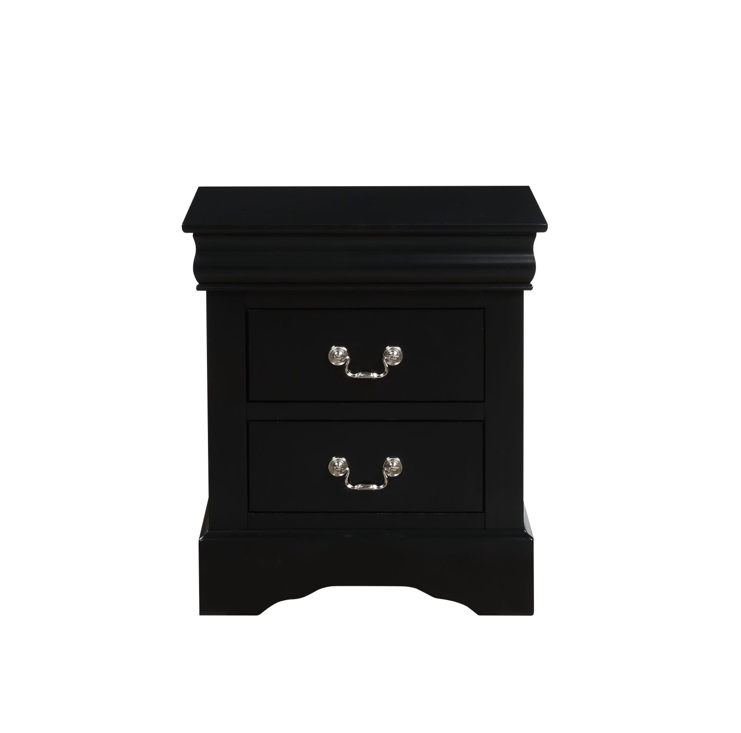 Upgrade your bedroom with this stylish Louis Philippe-inspired nightstand. Two drawers with easy-glide mechanisms and elegant brushed nickel handles offer plenty of storage space – all in a sophisticated black finish. PRODUCT DIMENSIONS: 22"W X 16"D X 24"HListing Includes: One Nightstand Only.Simple Assembly Required