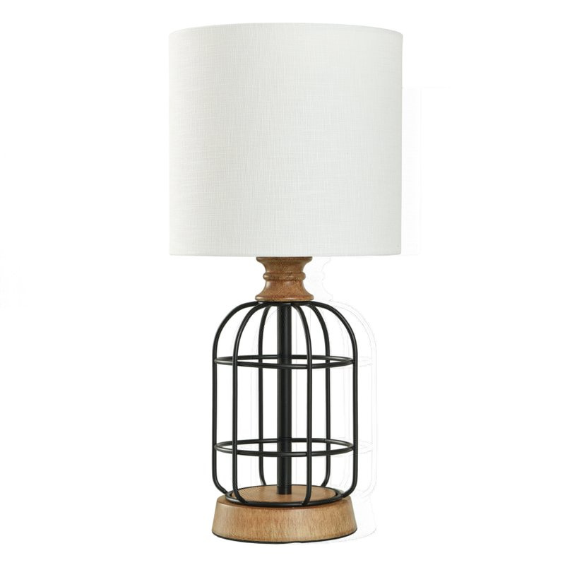Light a room with beauty and style. Create a sense of space and dimension with The Black Metal Cage Table Lamp with Wood It is ideal for setting on an end table, dresser, or desk to illuminate the area you are working or relaxing in. Suitable for living room, bedroom, den, kitchen or office. To maximize the brightness the recommended bulb is 60-Watt Type A or 10-Watt LED, bulb not included. The Cage Lamp has an easy on/off rotary switch with a cord that makes it easy to set up near any standard outlet. It is UL-Listed for safety. It features a rounded black metal cage with wood colored base and accents and a white drum shade. Add the Black Metal Cage Table Lamp to bring an extra dimension that complements a wide variety of decorative schemes with its farmhouse industrial look.