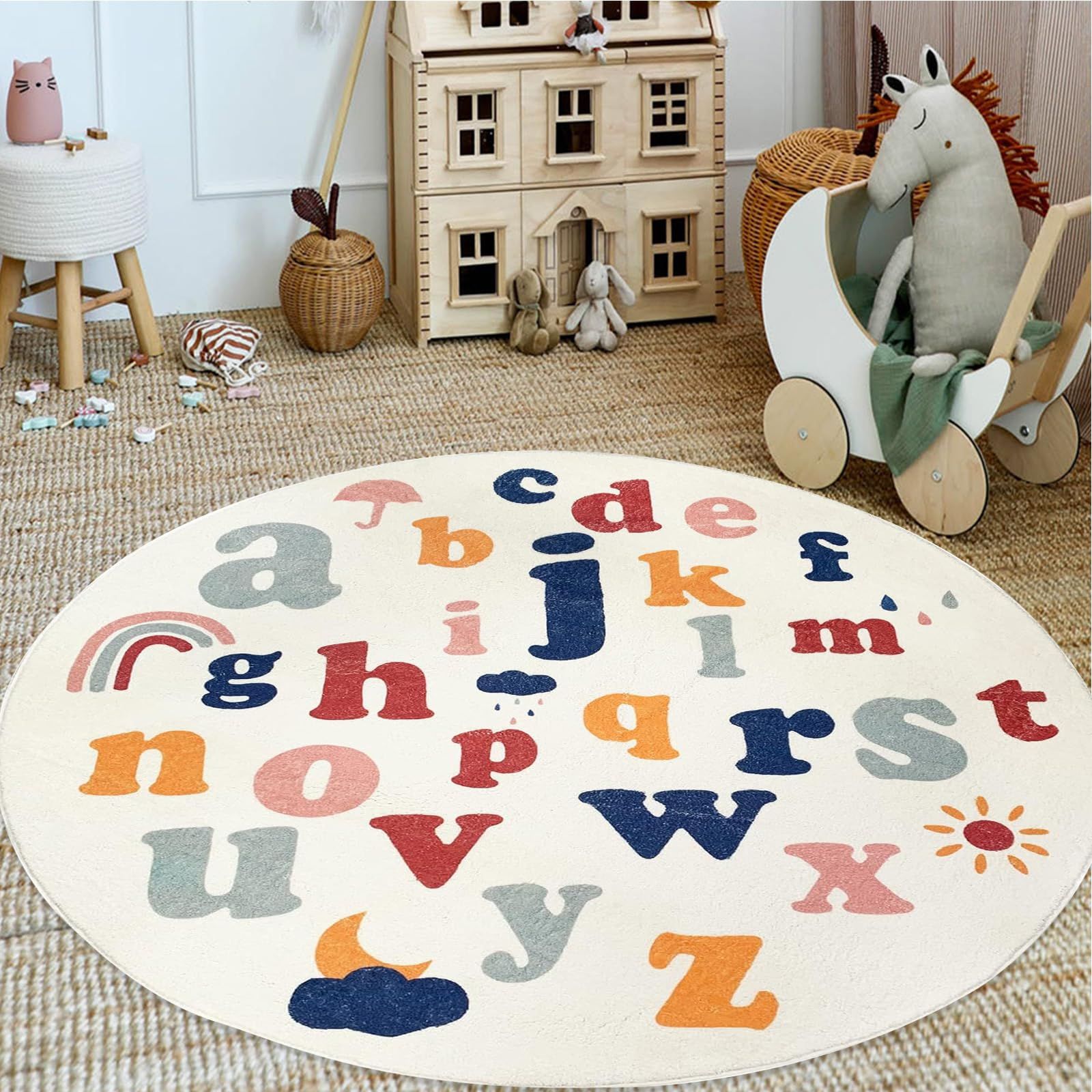 Home > Boho Round Rug 4 Ft Washable Area Rug for Kids Room, Colorful Sun Circle Rug for Playroom