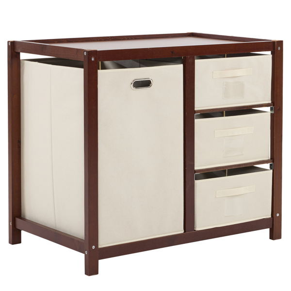 Introducing a versatile and space-saving pine wood changing table, expertly designed to combine practical functionality with a warm, inviting aesthetic. Finished in a rich coffee brown painted surface, this sturdy unit provides a safe and comfortable height for diaper changes at 87.5cm tall. The smart design includes a removable top panel, allowing it to transform into a standard storage cabinet as your child grows. It features three spacious fabric drawers and one large fabric storage bin, offering ample space for organizing all nursery essentials. With its compact footprint and durable construction, this changing table is the perfect, stylish organizational hub for any baby's room.