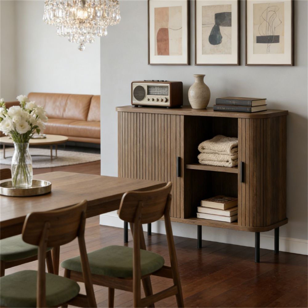 - Nordic style with slatted tambour doors adds a unique, decorative touch