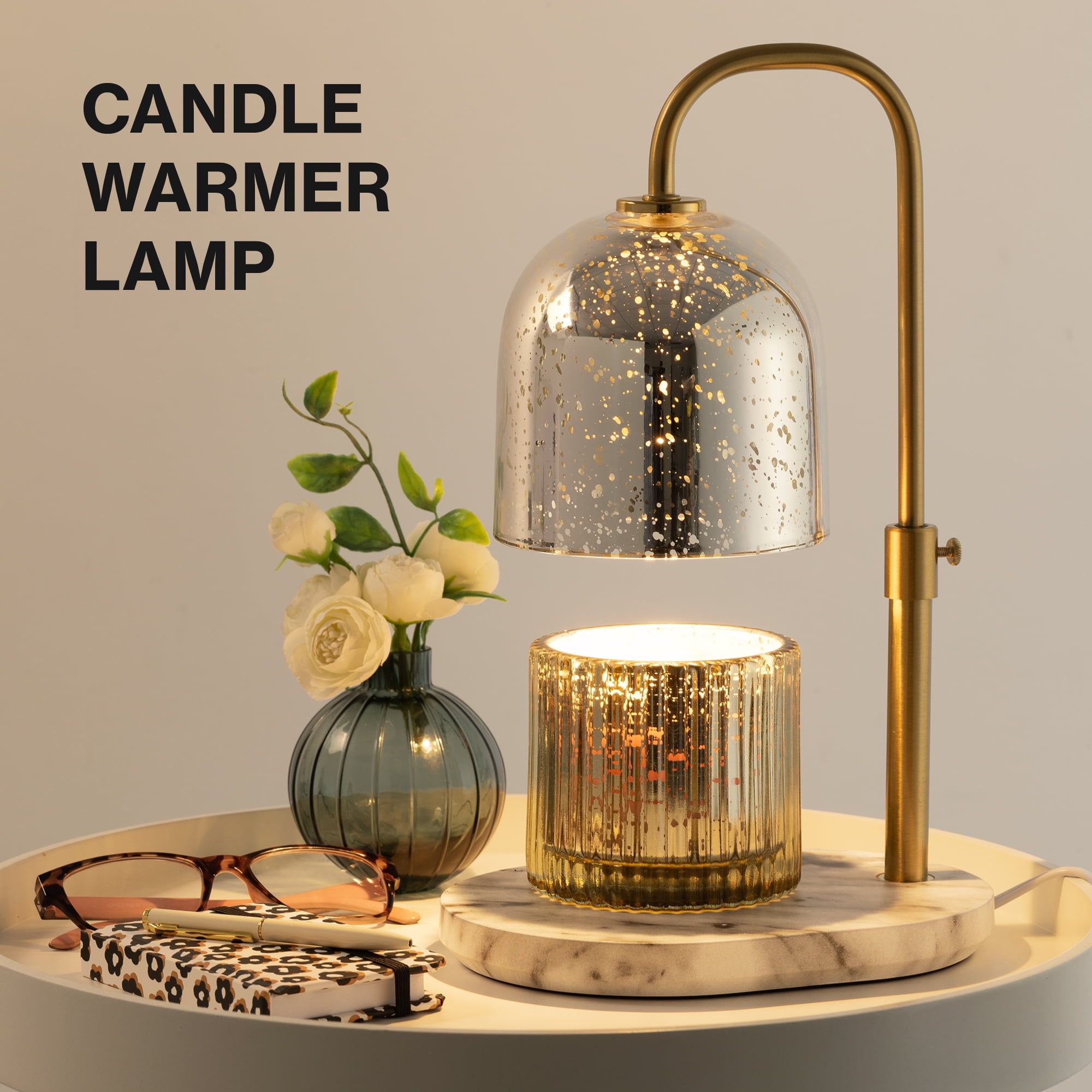 Candle Warmer Lamp, Glass Shade with Adjustable Gold Metal Pole, Flameless
