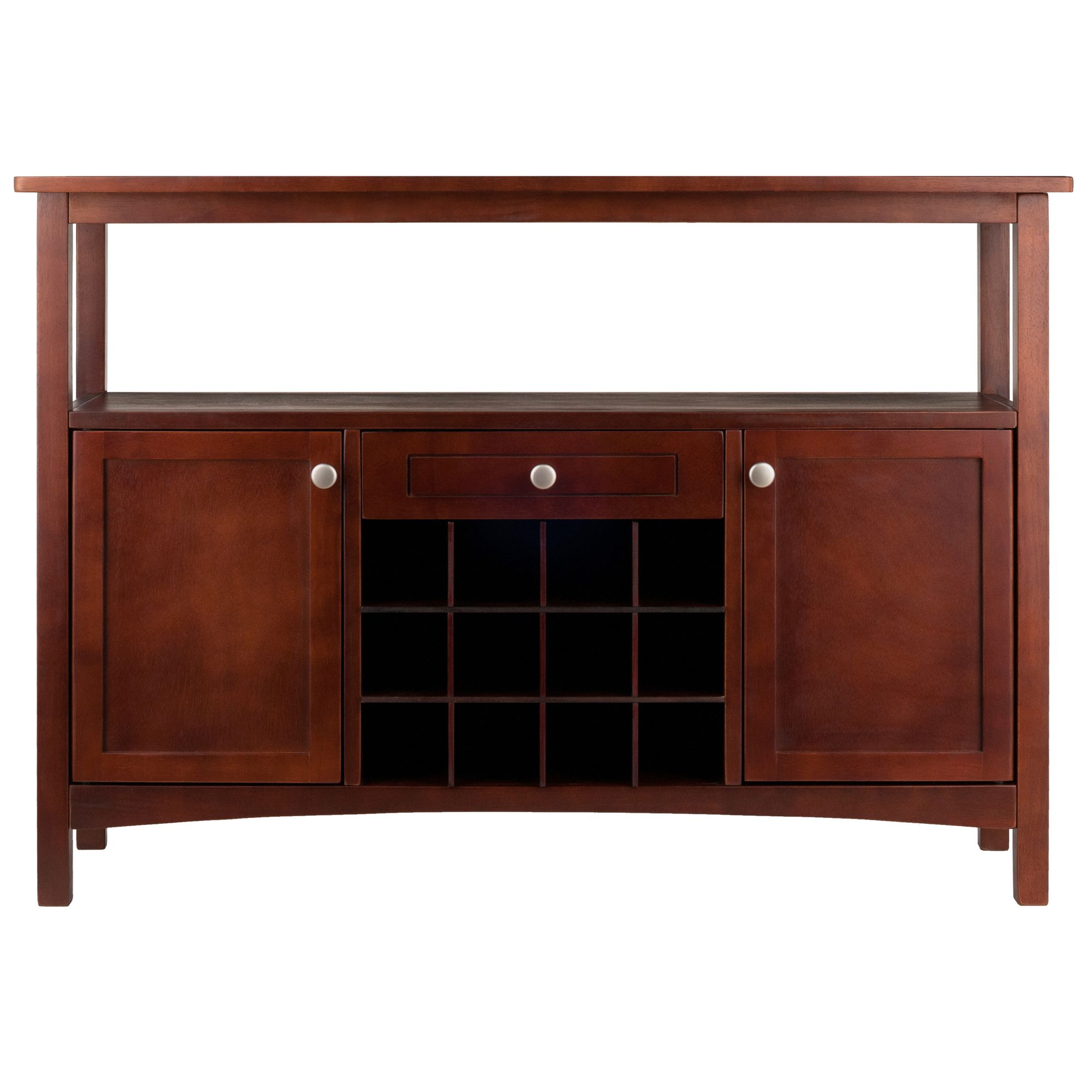 Versatility is the hallmark of the Colby Buffet Cabinet. This handsome piece can be the highlight of your living room to store your wine and stemware and display collectibles. Or let it stand out in the dining room as a sideboard to showcase your best serveware; while keeping a few favorite bottles of wine on hand. The buffet features two cabinets on either side of a 12-bottle wine grid. Each cabinet has a removable shelf that expands the storage height for bottles or decanters. The broad open shelf is ideal for setting out glasses and plates; or for display purposes. And a drawer provides space for silverware and bar accessories. Constructed of Solid and Composite Wood in a lovely Walnut finish.