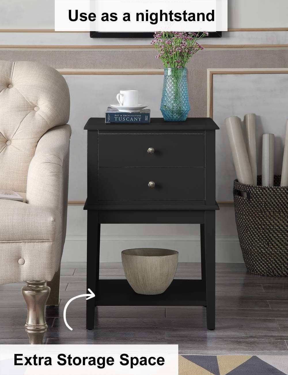 3.Decent Looking and Decently Sturdy - This Black nightstand is not only large but also sturdy and well made. The drawers have a large space and the round drawer pull makes the drawer easy to open and close.The side table with lower shelf also offers plenty of space to stack your books.
