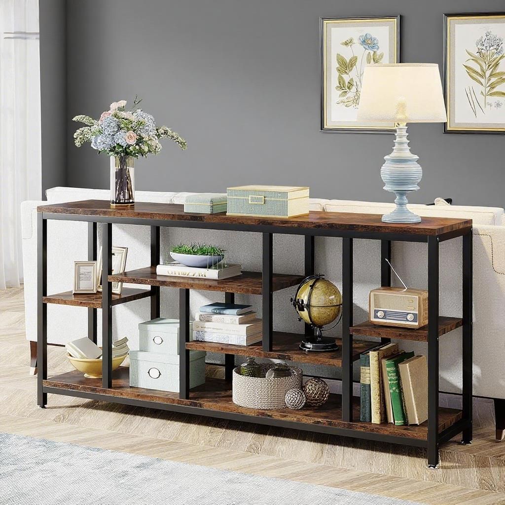 [More Shelves for Display & Storage]Extra long narrow tabletop(70.86' L x 11.8'W) is perfect for lamps, framed family photos, candles, books, and more. Our behind couch table with multi-staged shelves can meet your different needs while effectively help you say goodbye to disarray!