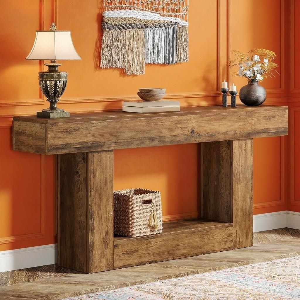 63" Farmhouse Console Table: Inspired by genuine farmhouse aesthetics, this entryway table exudes rustic simplicity and timeless charm. Its rustic brown-grain tabletop sits atop a U-shaped base, creating a striking look that encapsulates the essence of country-home design, adding a captivating touch to any decor