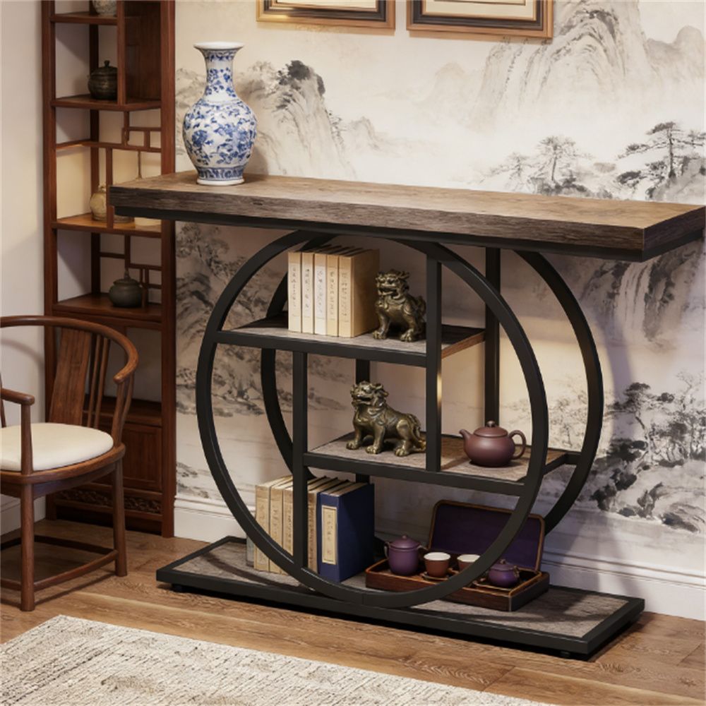 Industrial Flair - This 41.3" console table featuring a circular base offers an industrial chic vibe with its rugged design. The rustic brown finish of the table shelves exudes warmth and a vintage feel, while the central two shelves enclosed within a large circular metal frame create an eye-catching centerpiece in any hallway.