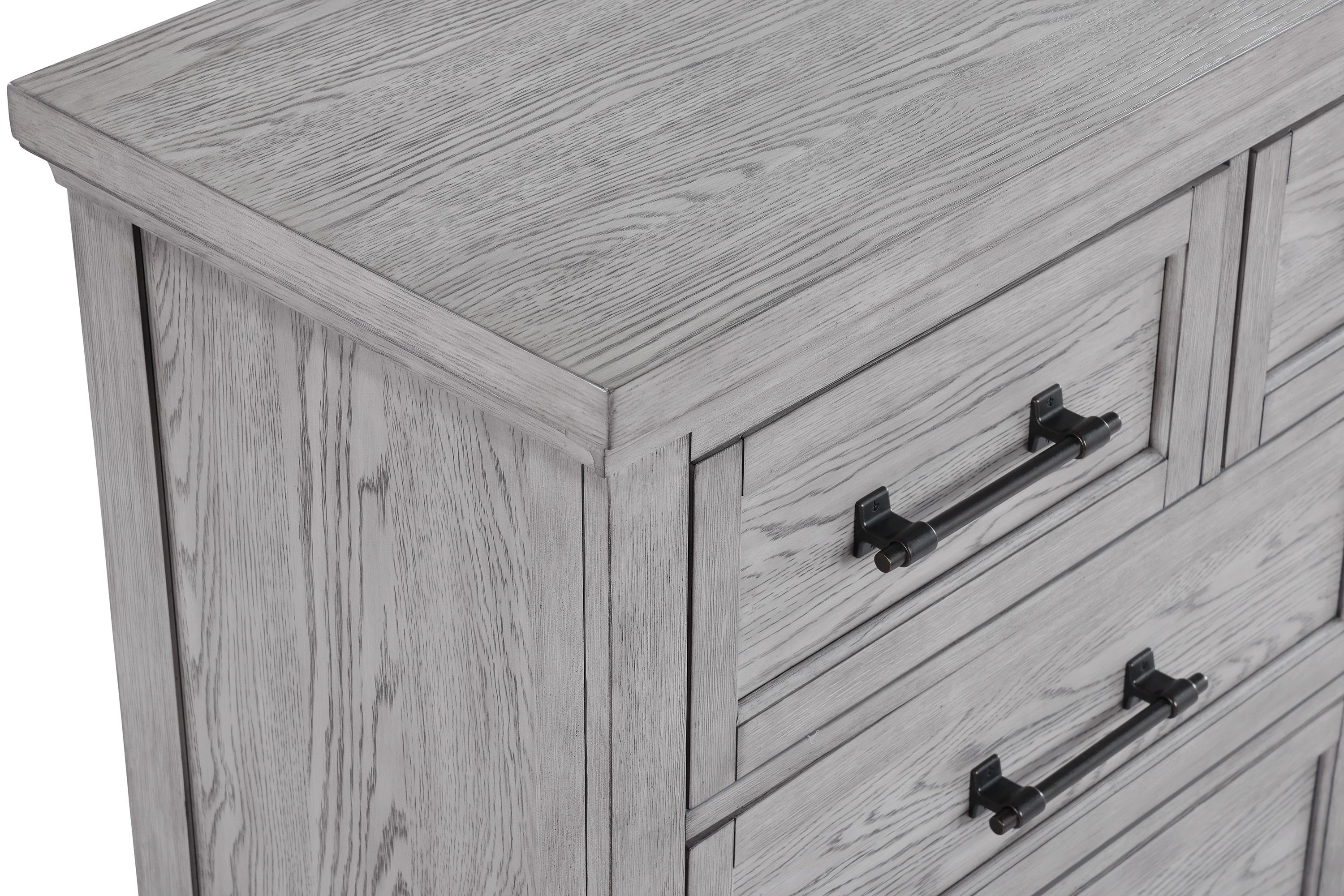 This collection dresser is an elegant and stylish piece of furniture designed to enhance the aesthetic of any bedroom. Its light gray finish adds a touch of sophistication and versatility, allowing it to seamlessly blend into various decor styles.