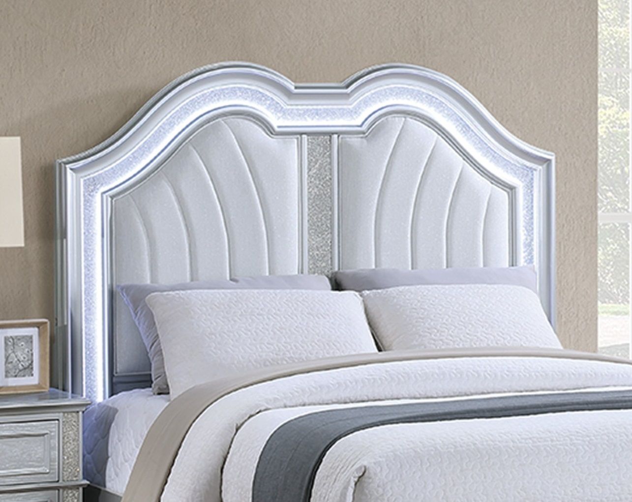 With its timeless design, luxurious details, and modern lighting features, this Queen bed is the ultimate choice for those who seek elegance, comfort, and a touch of contemporary glamour in their bedroom. This bed features a striking double-arched headboard that immediately draws attention with its graceful curves. The unique design is further accentuated by a shimmering glitter stripe running through the center, adding just the right touch of glamour. Built-in LED lights elegantly outline the headboard, creating a soft ambient glow that enhances the atmosphere of your room while offering a subtle, modern convenience. Whether you want to set a relaxing mood at night or add an extra touch of brilliance to your décor, the integrated lighting elevates your bedroom experience. The middle section of the headboard is upholstered in a soft fabric, offering a beautiful contrast against the light gray frame. Matching the grandeur of the headboard, the footboard mirrors the same exquisite design, featuring the double-arched silhouette. Additionally, it features a built-in bench, providing both style and functionality, making it an ideal spot to sit while getting ready for the day. The fabric adds a layer of sophistication while also providing a plush, inviting feel. The light gray color, subtly infused with a delicate sheen, enhances the bed's refined aesthetic, effortlessly complementing various bedroom styles and color schemes. Complete the look by adding the matching nightstand, chest, dresser, and mirror to create a cohesive and stylish bedroom set.