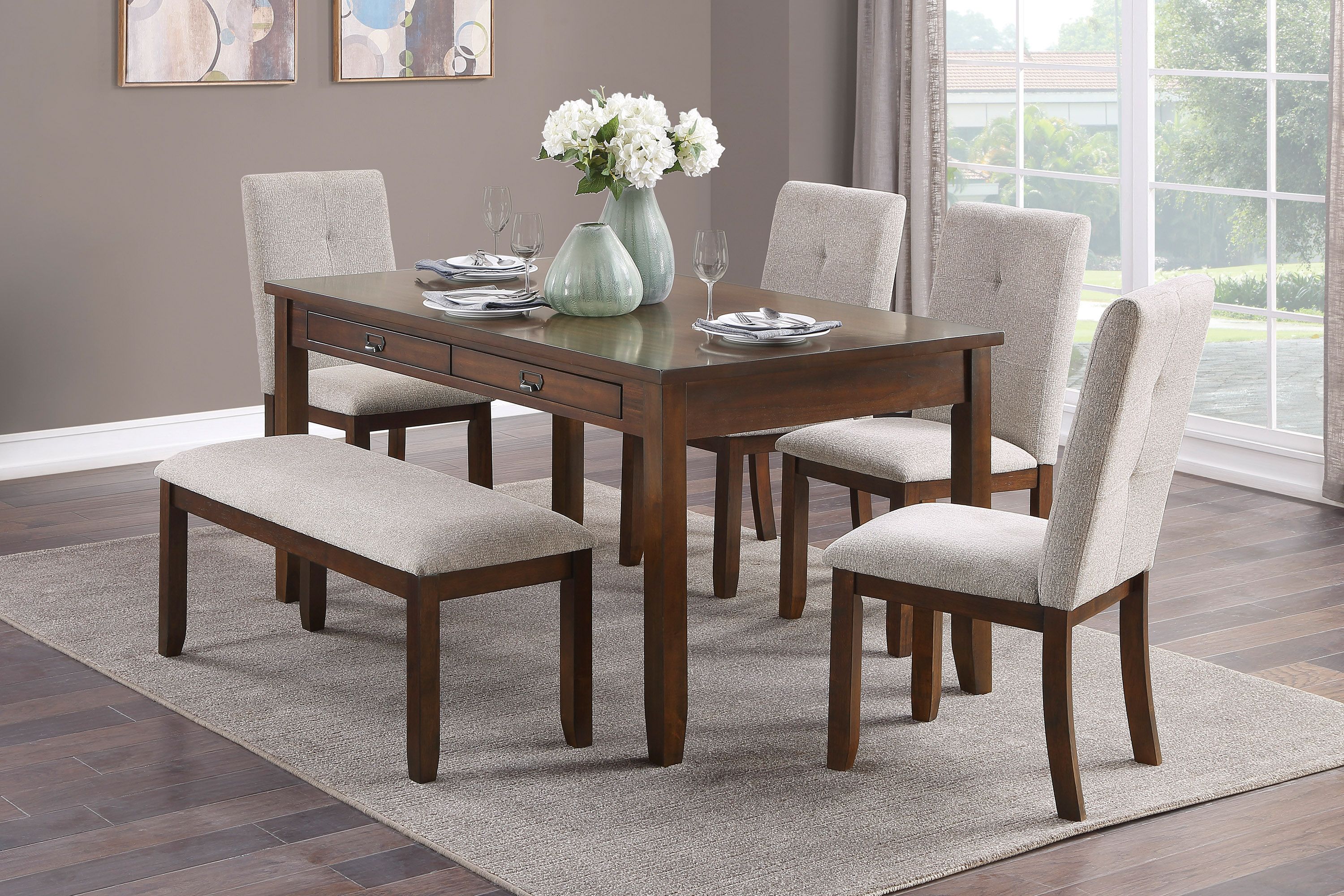Dining set includes dining room table, 1 bench and 4 side chairs