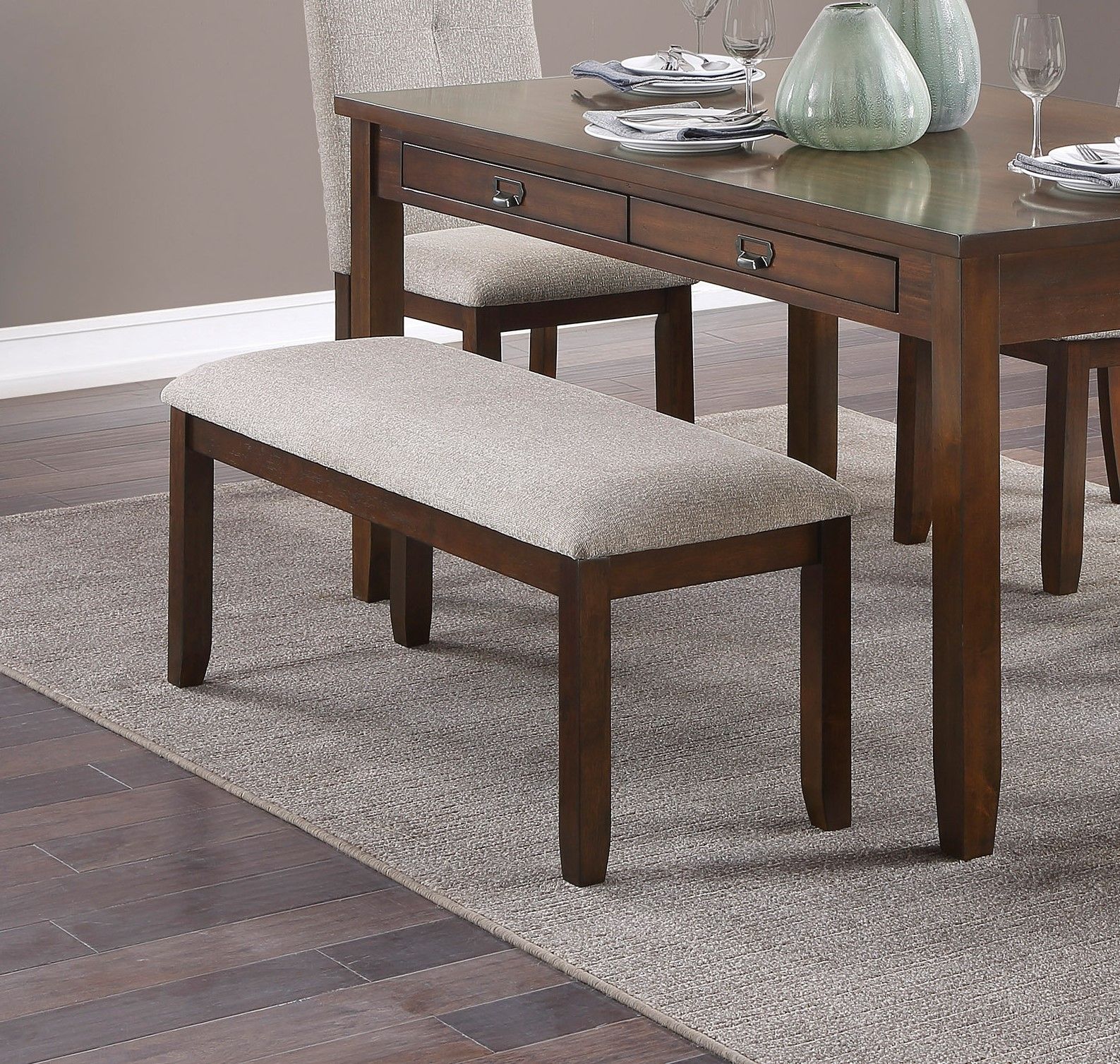The transitionally styled table is uniquely accented by the modern lines of the accompanying chairs in the Binghampton Collection. Neutral tone fabric seats present complementing contrast to the cherry finish over cherry veneer of the casual dining group. Four functional drawers are located on the table apron allowing for convenient storage of tabletop accessories within quick reach. The available bench complements the design of the side chairs, providing an option for customizing your seating experience.PRODUCT DIMENSIONS: TABLE: 60" x 36" x 30"HApron to floor: 24.5"Distance between legs from the shorter side: 29.5Distance between legs from the longer side: 53.5"Drawer interior: 21.5" x 11" x 2" (4)BENCH: 42.5" x 17" x 19"HCHAIR: 17.5" x 24.5" x 38.5"HSeat Width: 17.5"Seat Depth: 17"Seat Height: 19"Listing Includes: 6pc Dining Set (1 Table, 1 Bench and 4 Chairs) Only.Simple Assembly Require
