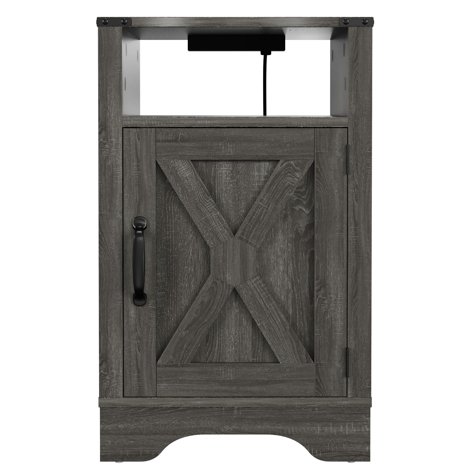 Farmhouse Nightstand Side Table, Wooden Rustic End Table, Tall Bedside Table with Electrical Outlets Charging Station - Dark Gray