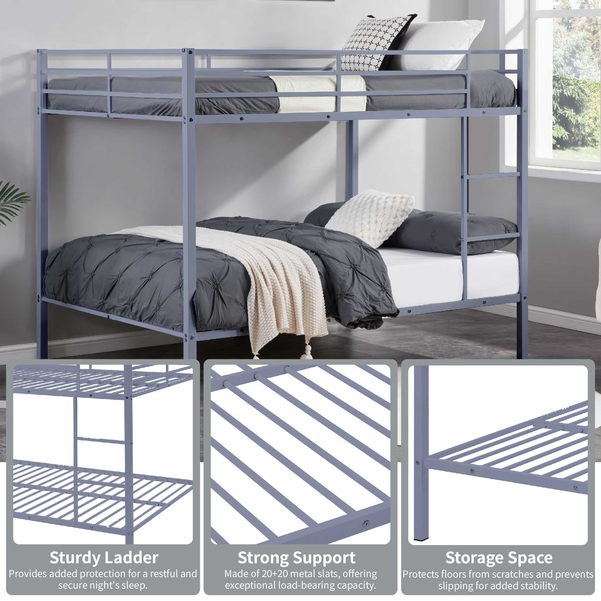 3. "Durable Heavy-Duty Metal Frame": "Constructed with a high-quality metal frame, this bunk bed provides sturdy support. The heavy-duty solid steel slats are naturally integrated into the frame, while the premium powder-coated metal surface offers a smooth, long-lasting finish that protects against corrosion and rust. Weight capacity"