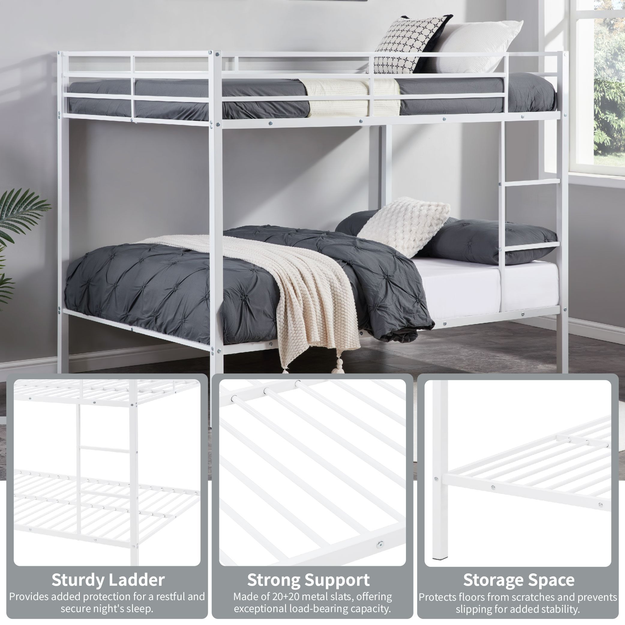 3. "Durable Heavy-Duty Metal Frame": "Constructed with a high-quality metal frame, this bunk bed provides sturdy support. The heavy-duty solid steel slats are naturally integrated into the frame, while the premium powder-coated metal surface offers a smooth, long-lasting finish that protects against corrosion and rust. Weight capacity"