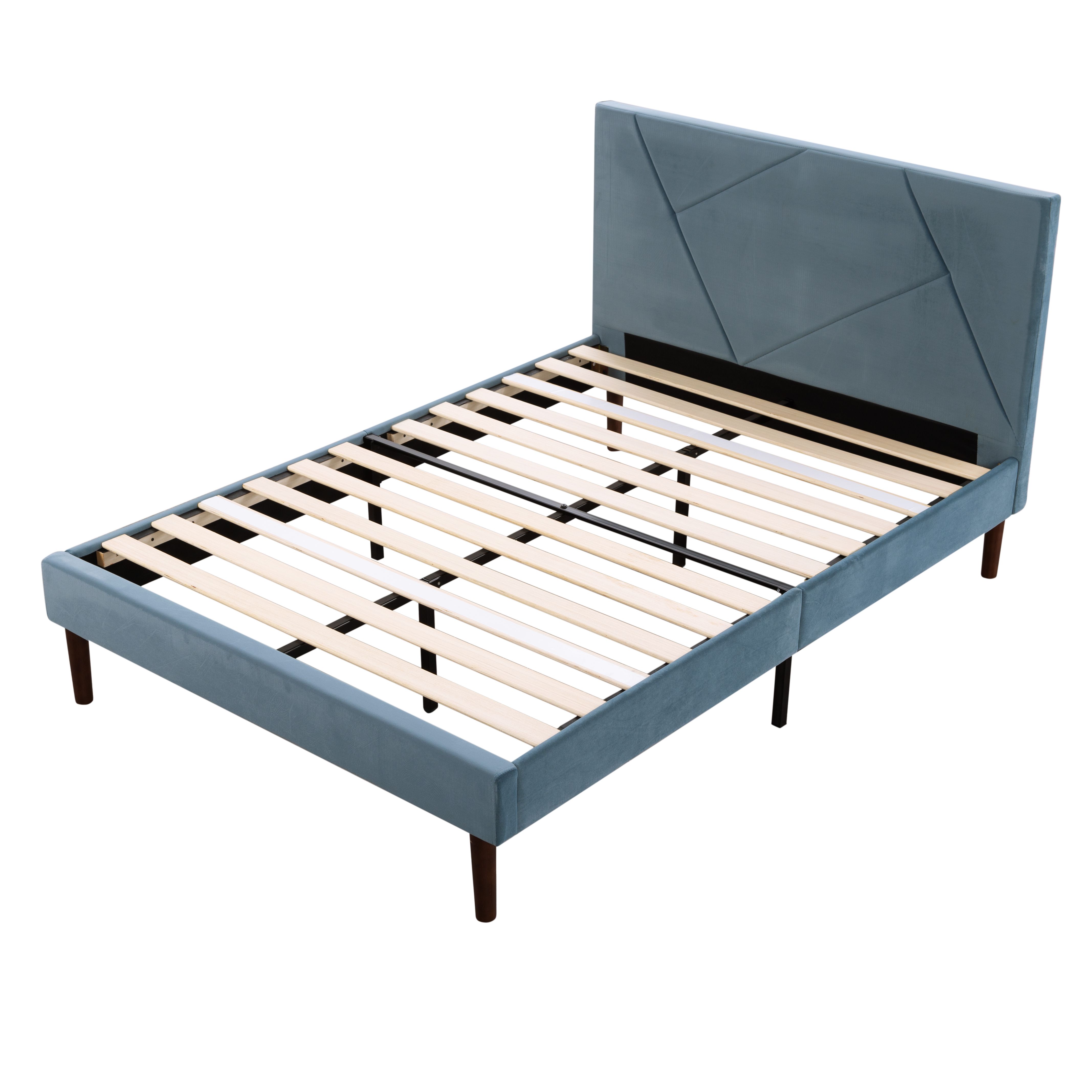 - FULL Size Platform Bed Frame with Upholstered Headboard and wood slats support. The simple and elegant design enhances your bedroom with a classic, cozy look, providing your family with a safe and comfortable sleep environment.