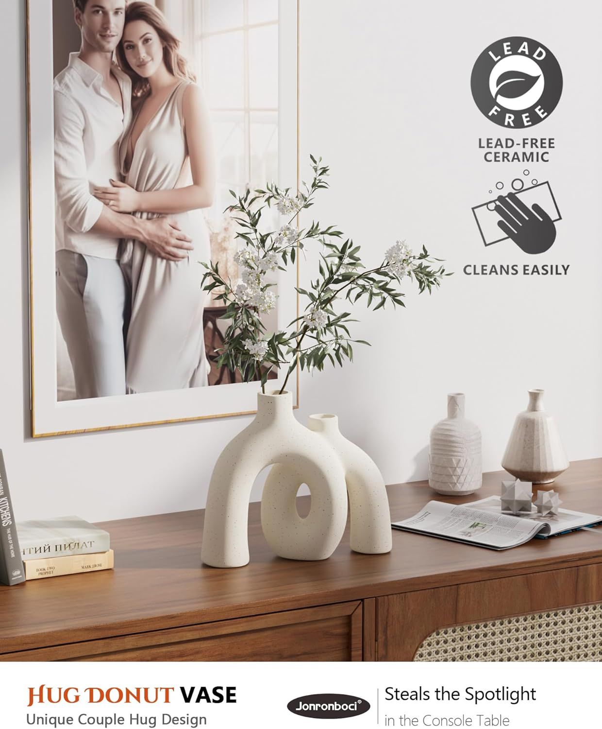 Hug Donut Decorative Vase Set - Modern Nordic Boho Style Vases Home Decor, Matte Ceramic Decorations for Living Room Shelf, Bookshelf Mantle Entryway Table or Console Décor Cream White