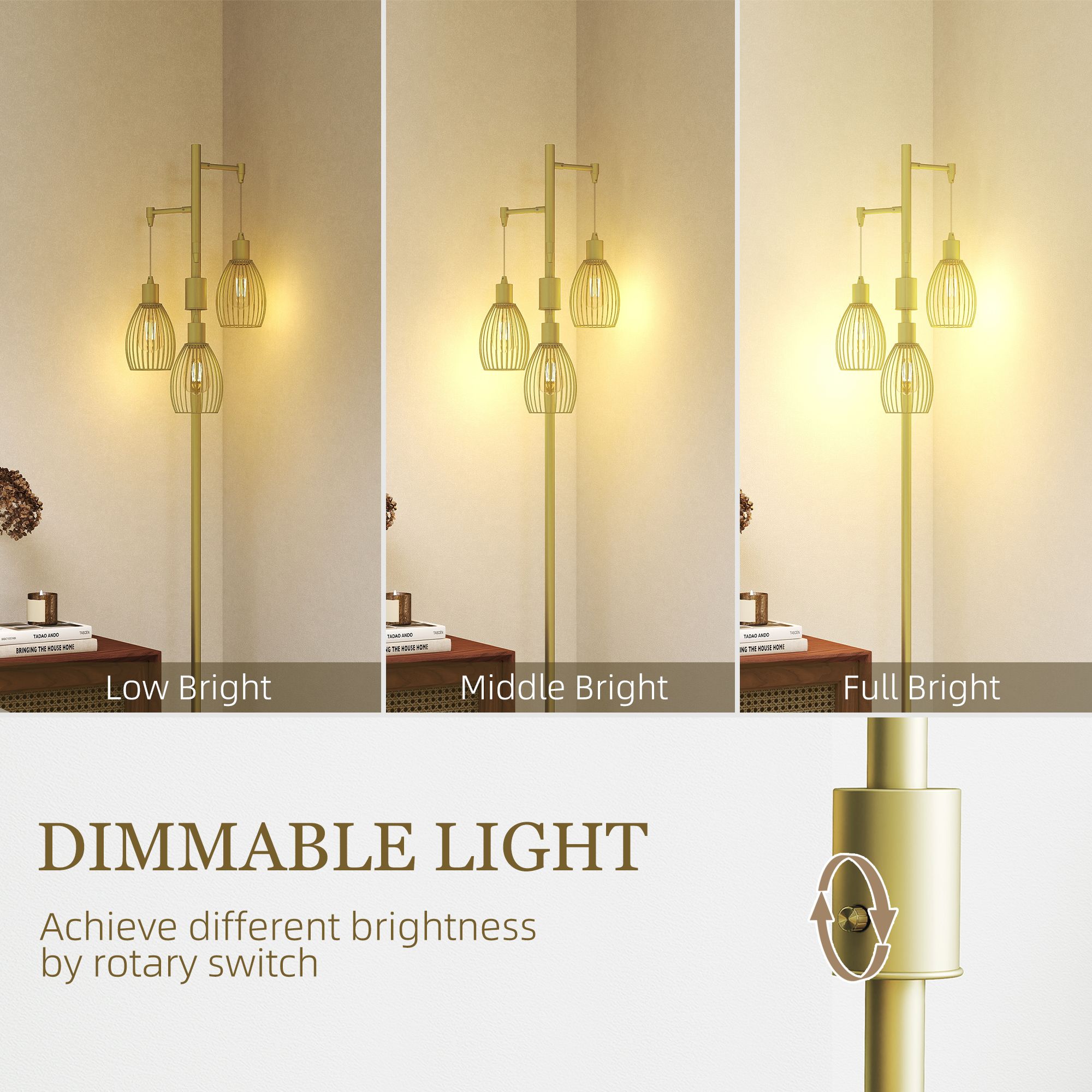 Industrial Floor Lamp with 3 Hanging Wire Lampshades, Dimmable Standing Lamp for Living Room, Gold