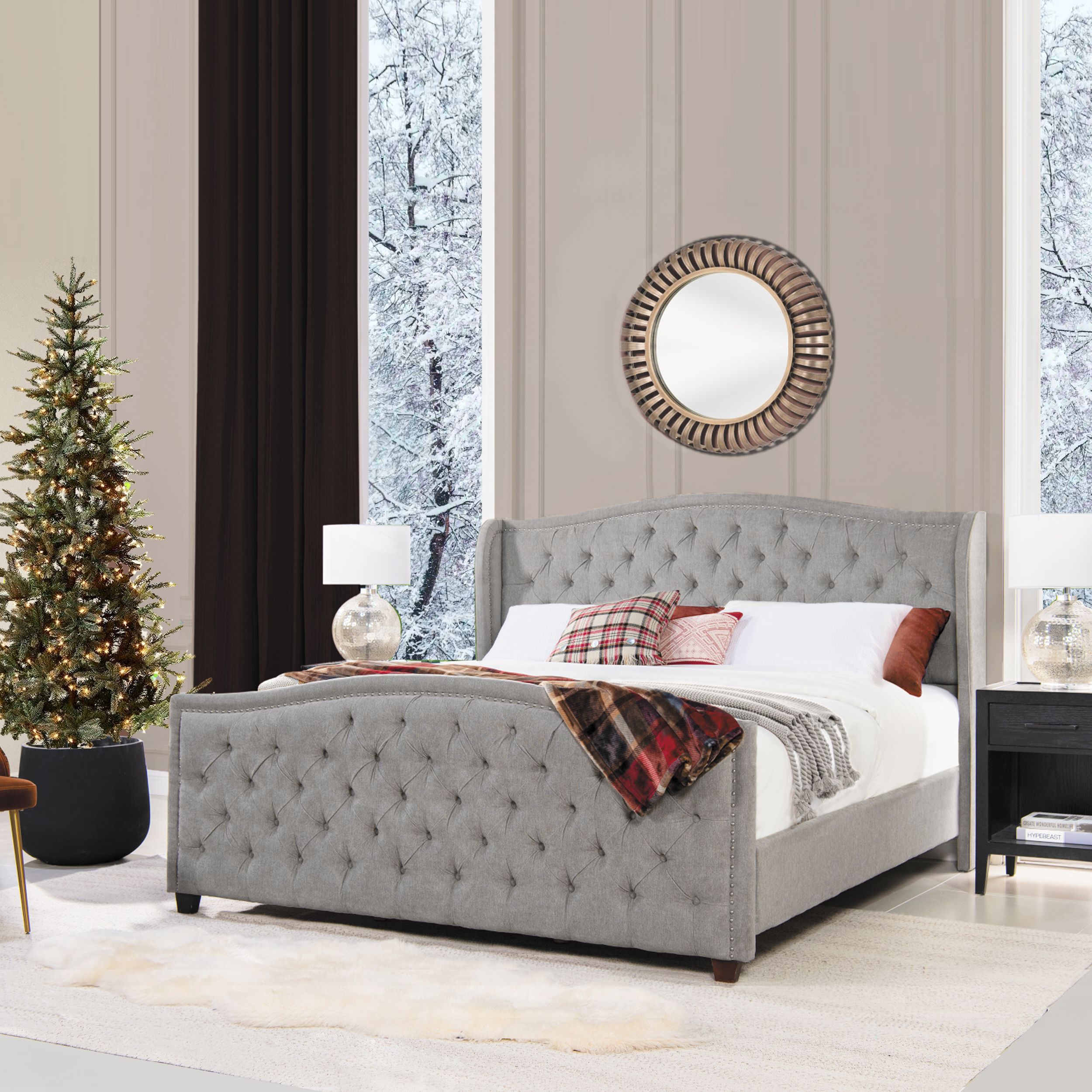 Marcella Upholstered Shelter Headboard Bed Set, King, Silver Grey Polyester