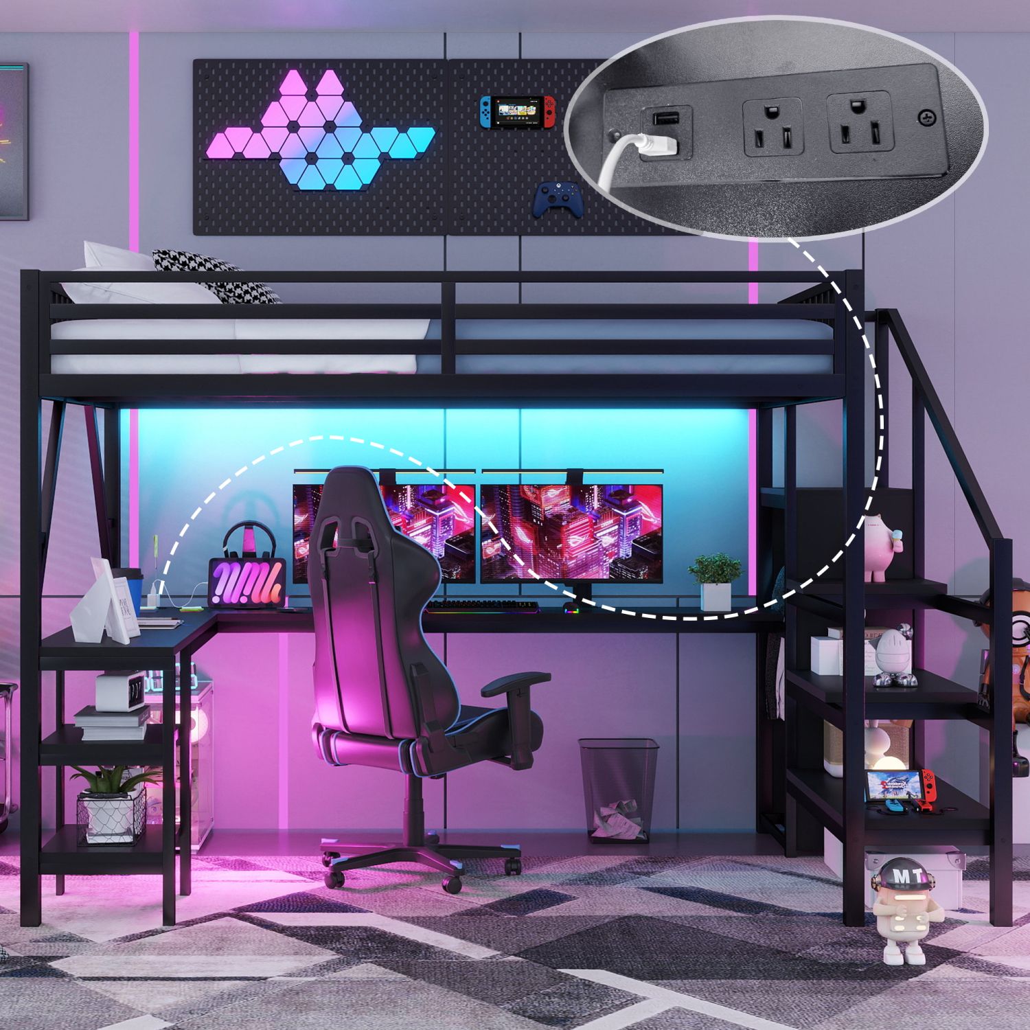 [Loft Bed with USB and LED]: The built-in charging station includes 2 outlets and 2 USB ports, which are convenient for charging your mobile phone, tablet, computer or gaming device. Queen size metal loft bed frame with RGB LED lights(over 60000 colors), in addition to directly adjusting the light colors in the APP or controller, you can customize the brightness, speed and timing modes. The lights offers a nice ambiance for your bedroom, bright up your night.