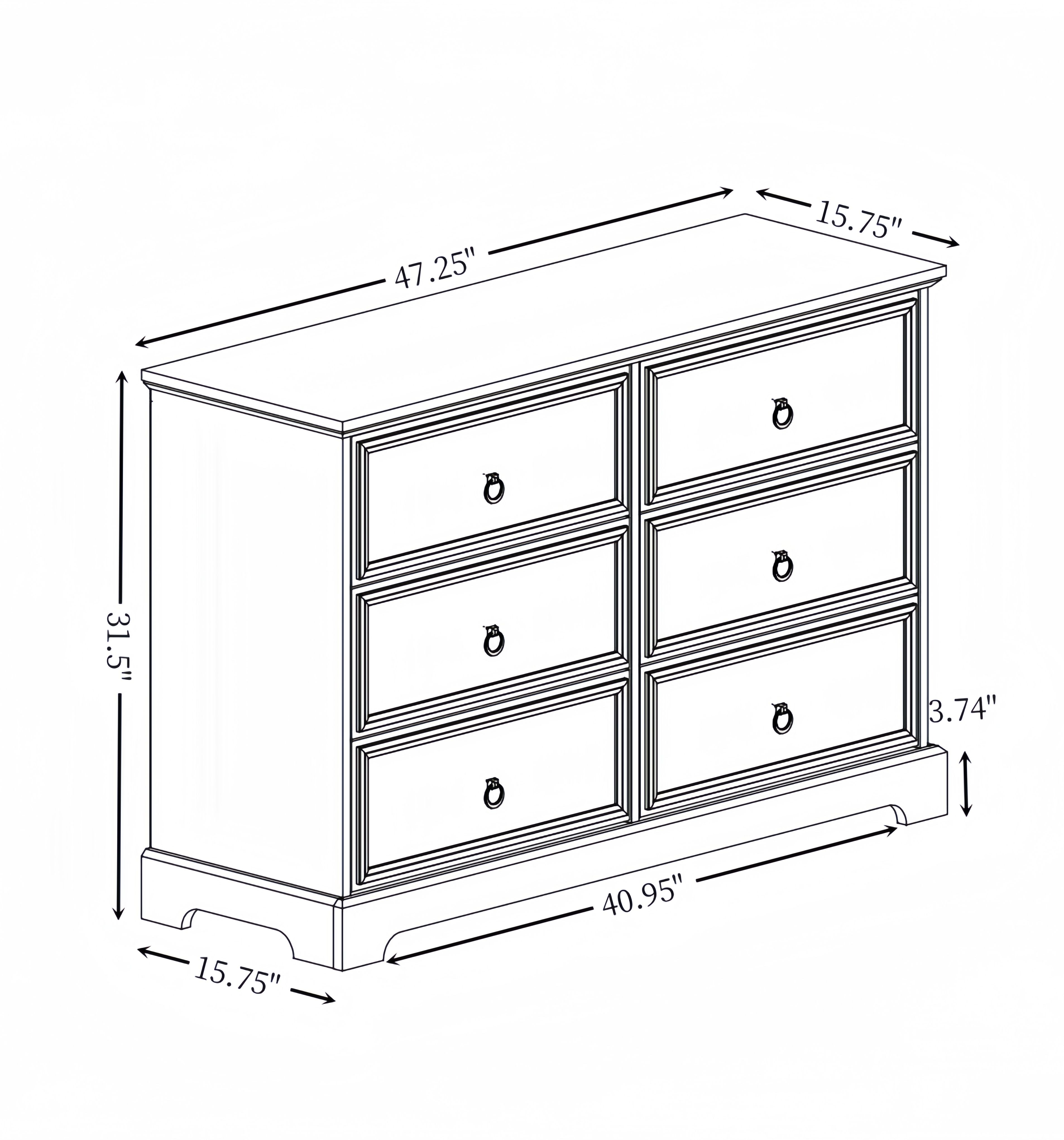 4.Dimension and Installation:The 6 drawer dresser measures 15.75"D x 47.24"W x 31.5"H. Including the accurate instruction which is easy to follow,the installation will be done in 60 minutes.