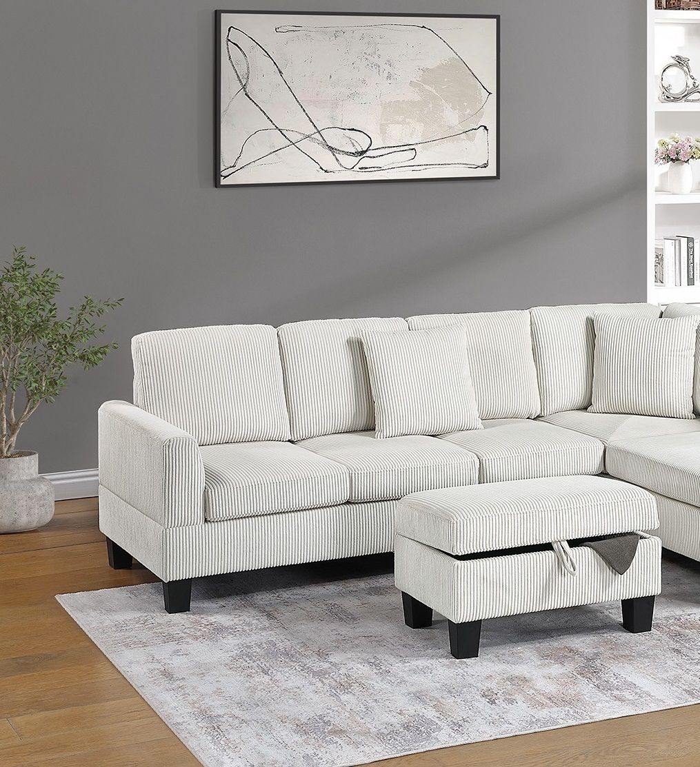 Whether you're entertaining guests or simply unwinding after a long day, this sectional provides the ultimate lounging experience. This sectional set includes a Right-Arm-Facing (RAF) Chaise, a spacious Sofa, and a Multi-Purpose Storage Ottoman, offering plenty of room to stretch out and unwind. The RAF chaise provides the perfect spot to kick back, whether you're watching TV, reading a book, or simply enjoying a moment of relaxation. The coordinating storage ottoman adds another layer of versatility, serving as a footrest, an extra seating option, or even a coffee table alternative. Lift the cushioned top to reveal a hidden storage compartment, ideal for keeping blankets, magazines, or remote controls organized and within reach. Wrapped in a soft, textured corduroy fabric, this sectional set is designed for both style and relaxation. The deep, well-padded seats provide a cloud-like feel, while the supportive back cushions cradle you in comfort. The ribbed texture of the corduroy adds depth and dimension, giving the sectional a rich, inviting look that complements a variety of home décor styles. To complete the look, this sectional set comes with two matching accent pillows, adding a touch of contrast and extra comfort. These pillows not only enhance the sectional's aesthetic appeal but also provide additional lumbar support for a cozy lounging experience.
