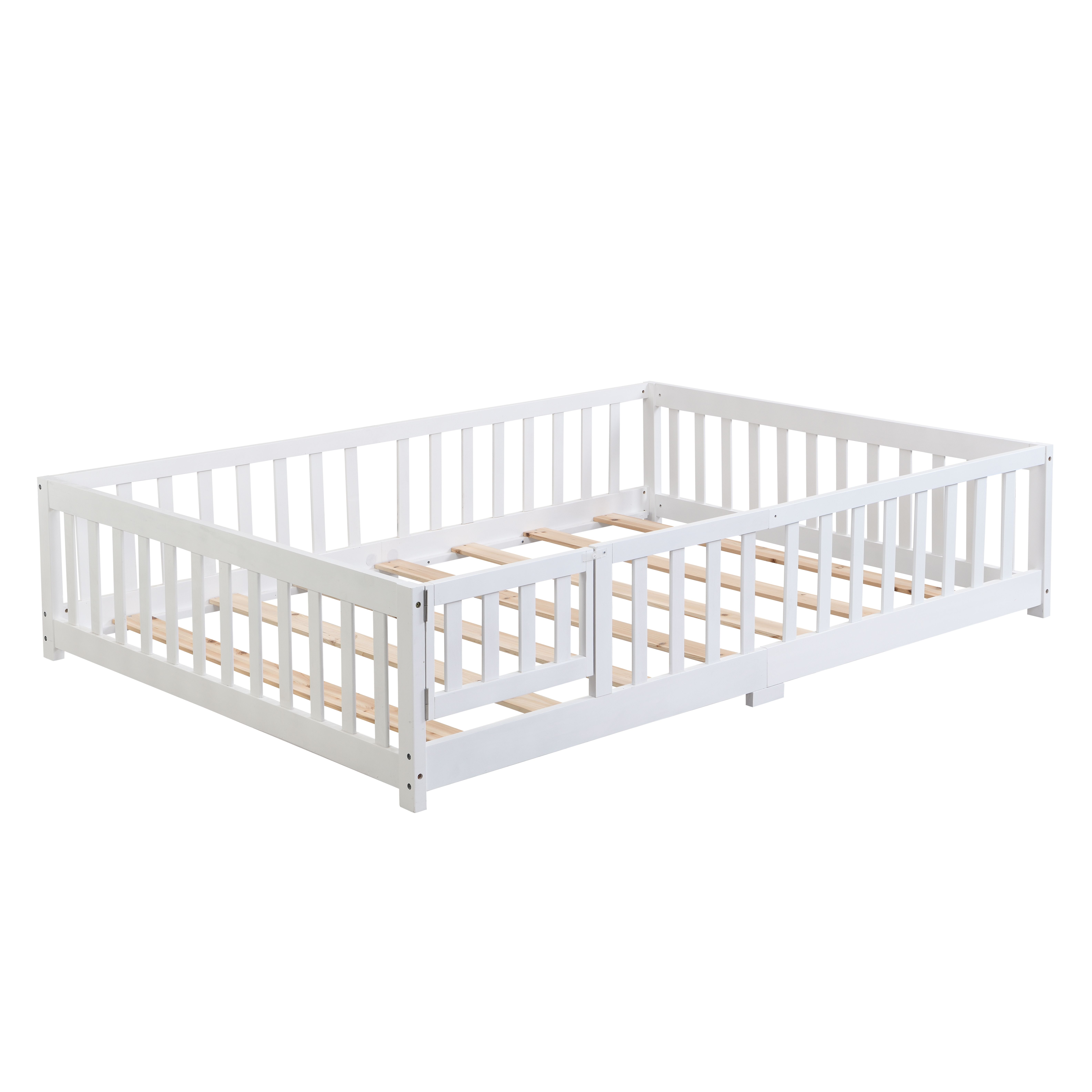 Full Size Floor Bed with Door, Solid Wood Platform Bed Frame with Fence, Suitable for children, Pine Wood
