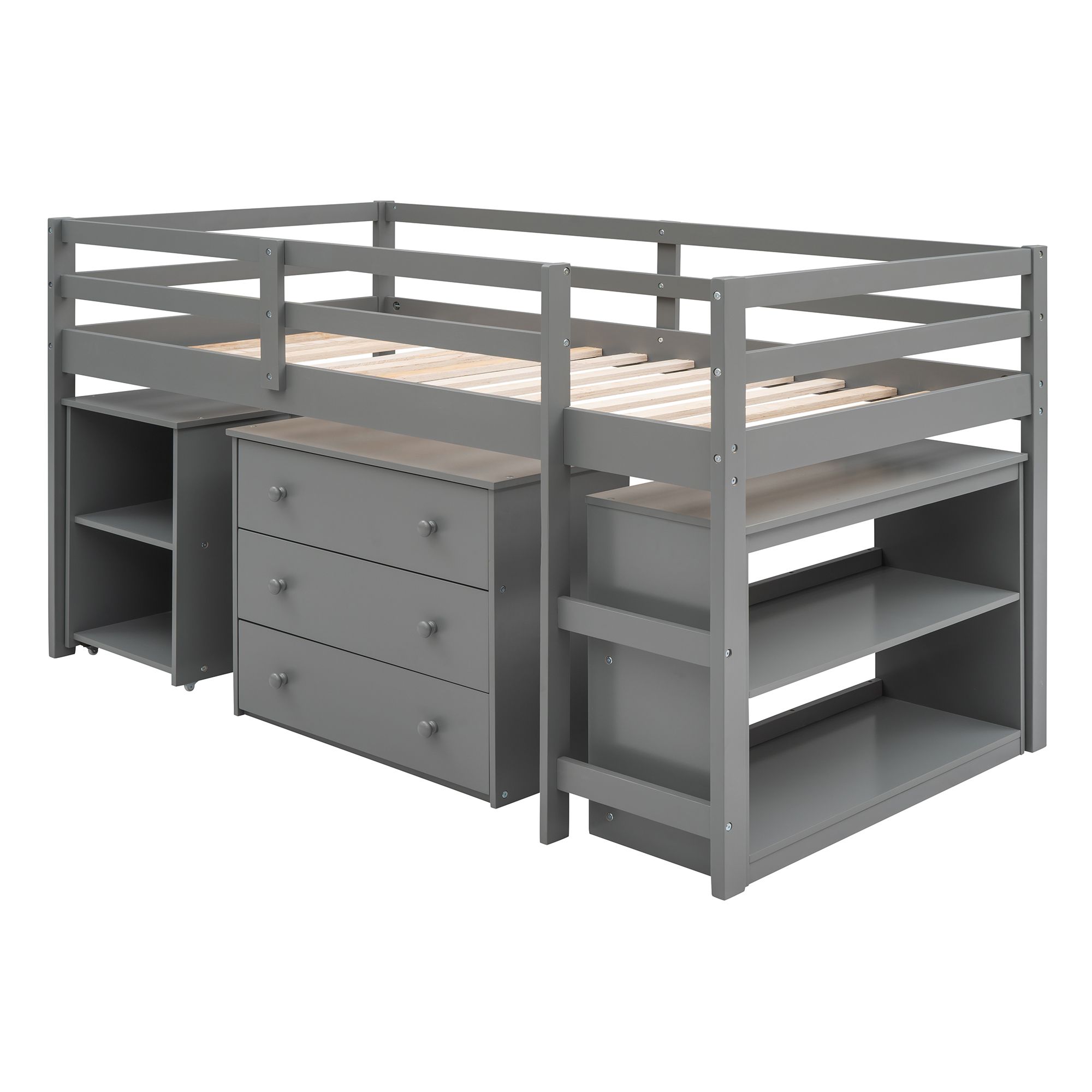 Crafted with high grade manufactured pinewood; enjoy the Loft bed in the shades espresso; gray and white to match the color scheme of any room. Designed with a loft structure; enjoy the space underneath used to house storage drawers and a portable desk fitted with base wheels. When the desk is needed; simply roll it out from under the loft for more workspace and an instant engaging underside fort area for your family to play in and let their imagination run wild. Three underside storage drawers coupled with a two-tier bookshelf provide plenty of storage options for you to help keep space tidy and organized. The built-in three rung ladder provides easy access to the twin sized bed featuring full length safety guardrails.