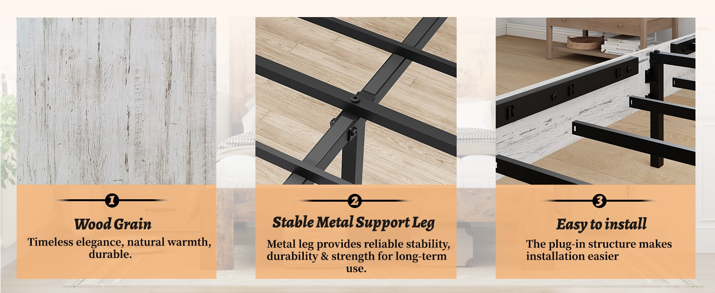[Sturdy and Only One Box] Constructed from high-quality metal frame and solid wood slats. Wood slats reinforce the sturdiness and durability of the platform queen bed structure. Bed in a box, don't have to worry or wait for the second box.
