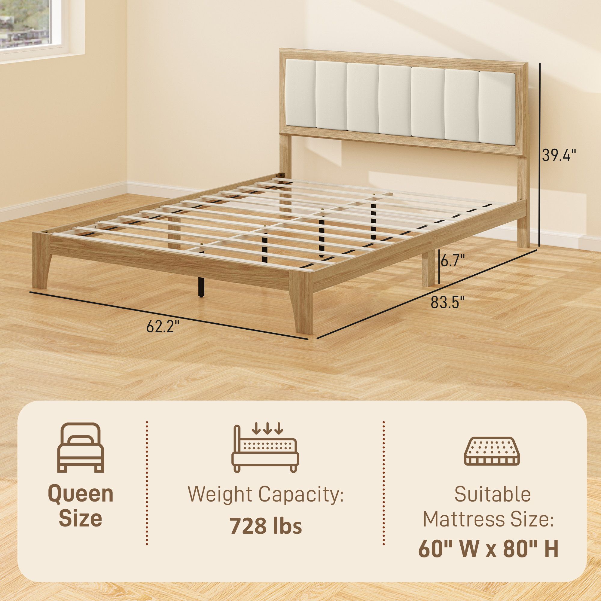 5.- Queen Size Platform Bed Frame Information: Overall dimensions: 83.5"" L x 62.2"" W x 39.4"" H. Suitable mattress size: 60"" W x 80"" D.