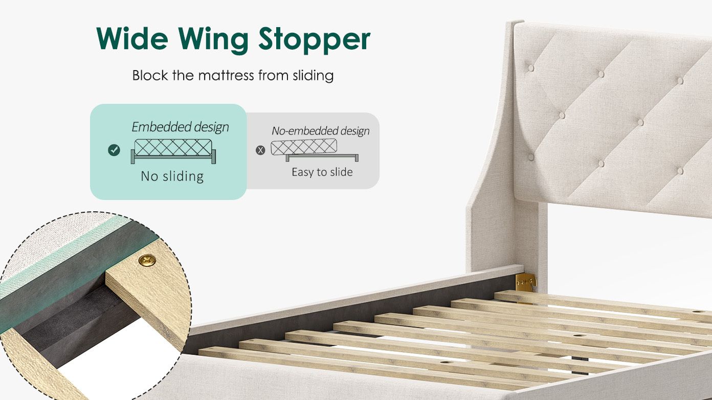 The wooden slats and center support legs have excellent load-bearing. Maximum load capacity up to 705 lbs. The bed frame is noiseless and equipped with plastic mats to protect the floor.