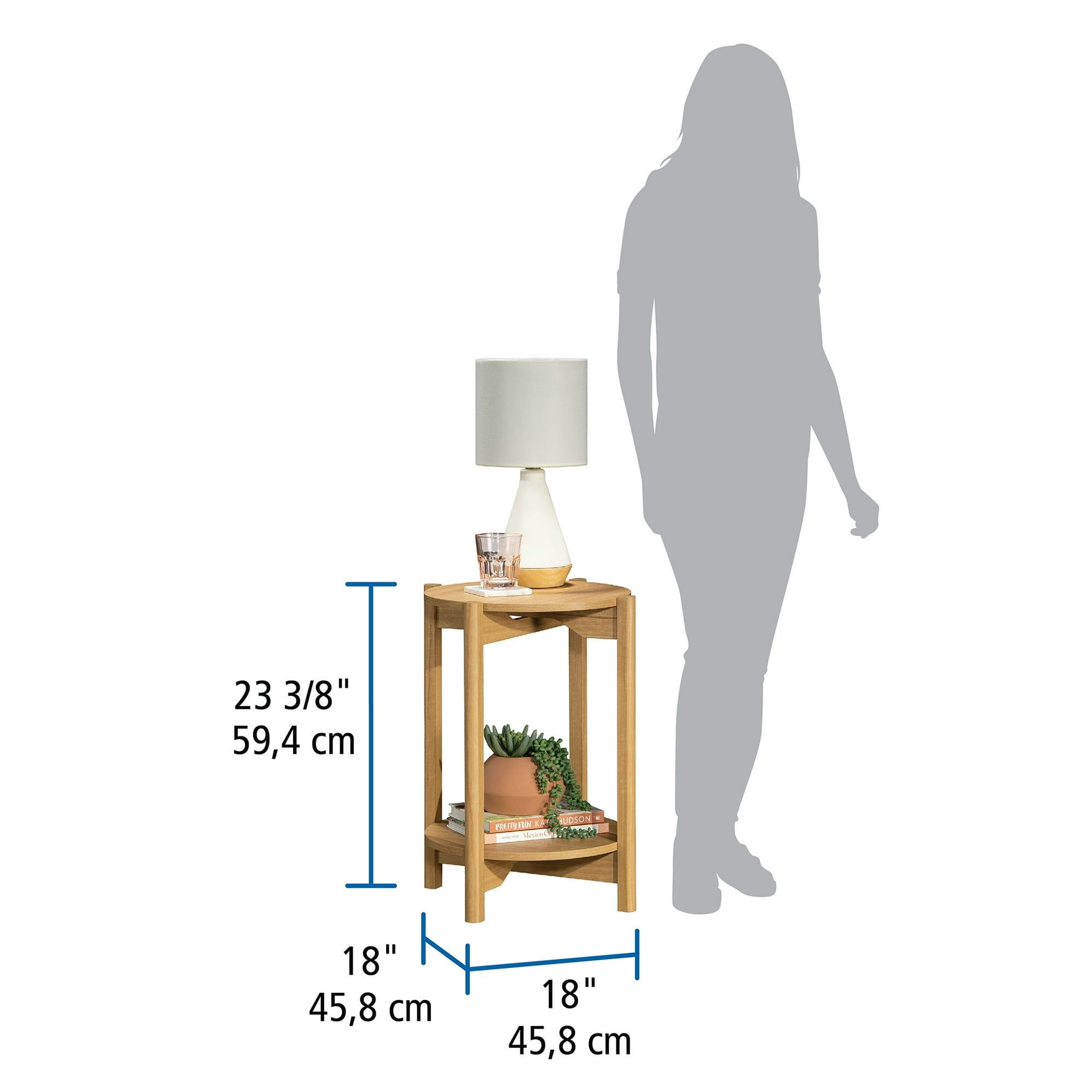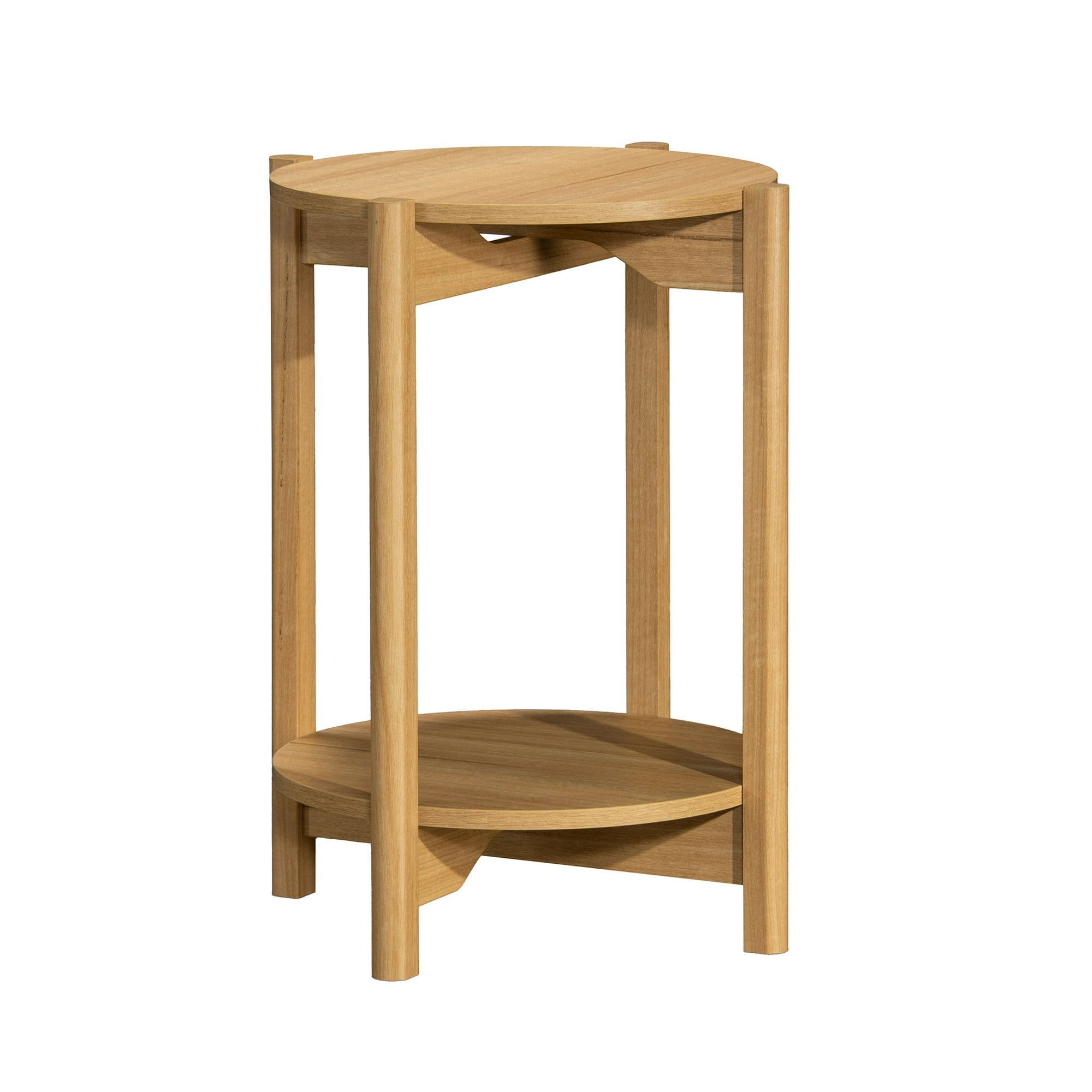 Modern Design: This round end table features a sleek, modern style with minimalist and Scandinavian-inspired charm, perfect for contemporary home decor.Versatile Placement: Finished on all sides in a natural teak finish, this accent table allows for versatile placement in any room, including living areas, entryways, or beside the bed.Ample Storage: Two layers of open shelving provide convenient storage and display options for beloved heirlooms, lamps, or decorative items.Natural Finish: The table boasts a light and neutral natural teak finish, adding an organic and beautiful accent to any interior.