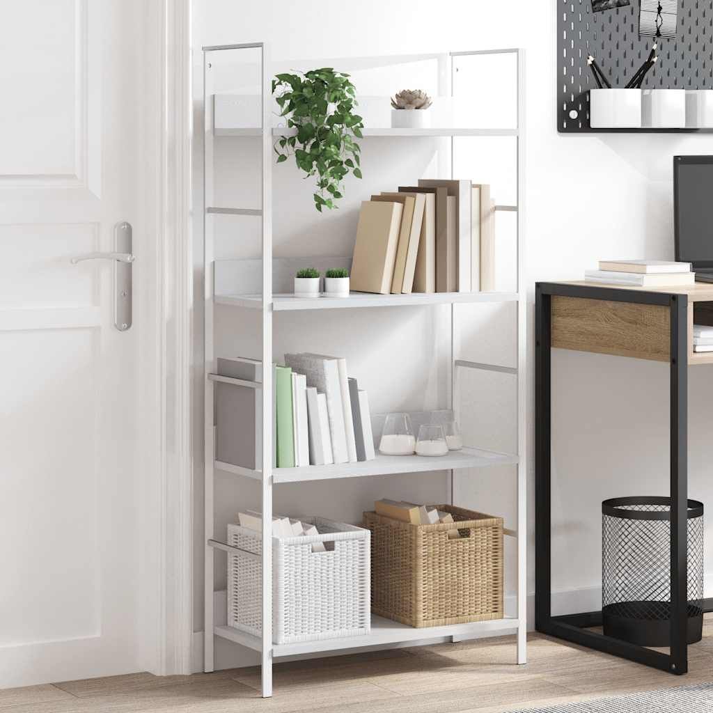 This 4-tier bookshelf is a stylish piece that combines function with a trendy industrial look, perfect for displaying your favorite books and decorations. Great for indoor spaces like living rooms, bedrooms, and kitchens, it brings a charming vibe to any room and adds character with its sleek lines and pristine white finish.
