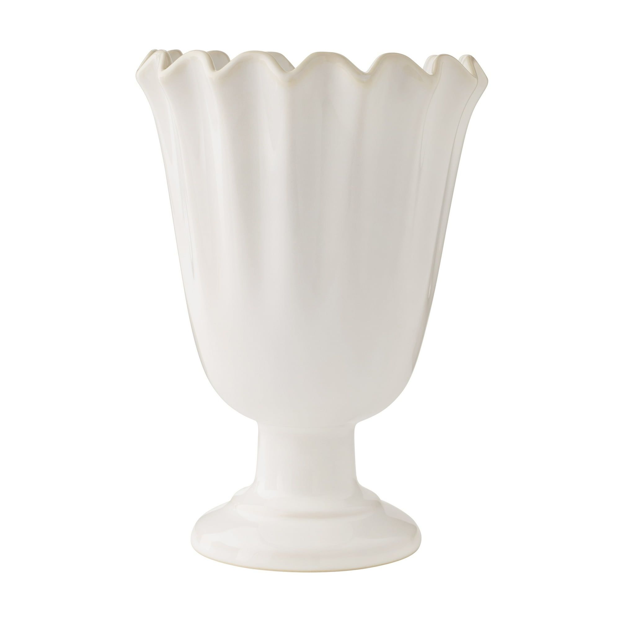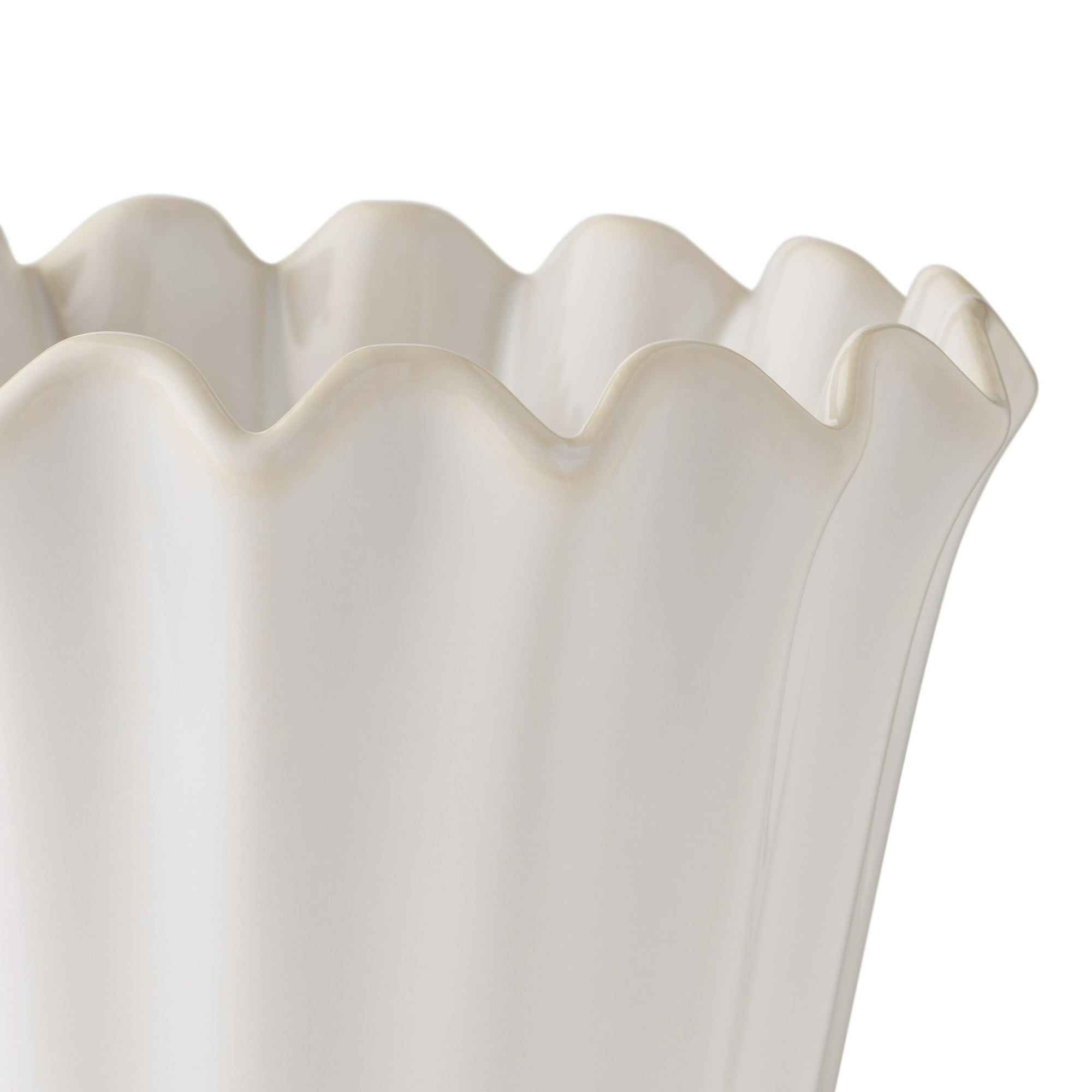 Durable Stoneware: Crafted from durable stoneware, this vase features a glossy cream finish, ensuring lasting appeal and a timeless aesthetic.Vintage Design: The vase showcases a scalloped rim and a fluted shape, adding a graceful vintage character to any space.Generous Dimensions: Standing 9 inches tall and 6.5 inches wide, it is perfectly sized for medium to large floral arrangements.Versatile Decor: Its neutral cream tone allows it to blend effortlessly with various decor styles and seasons, from farmhouse to modern cottage.