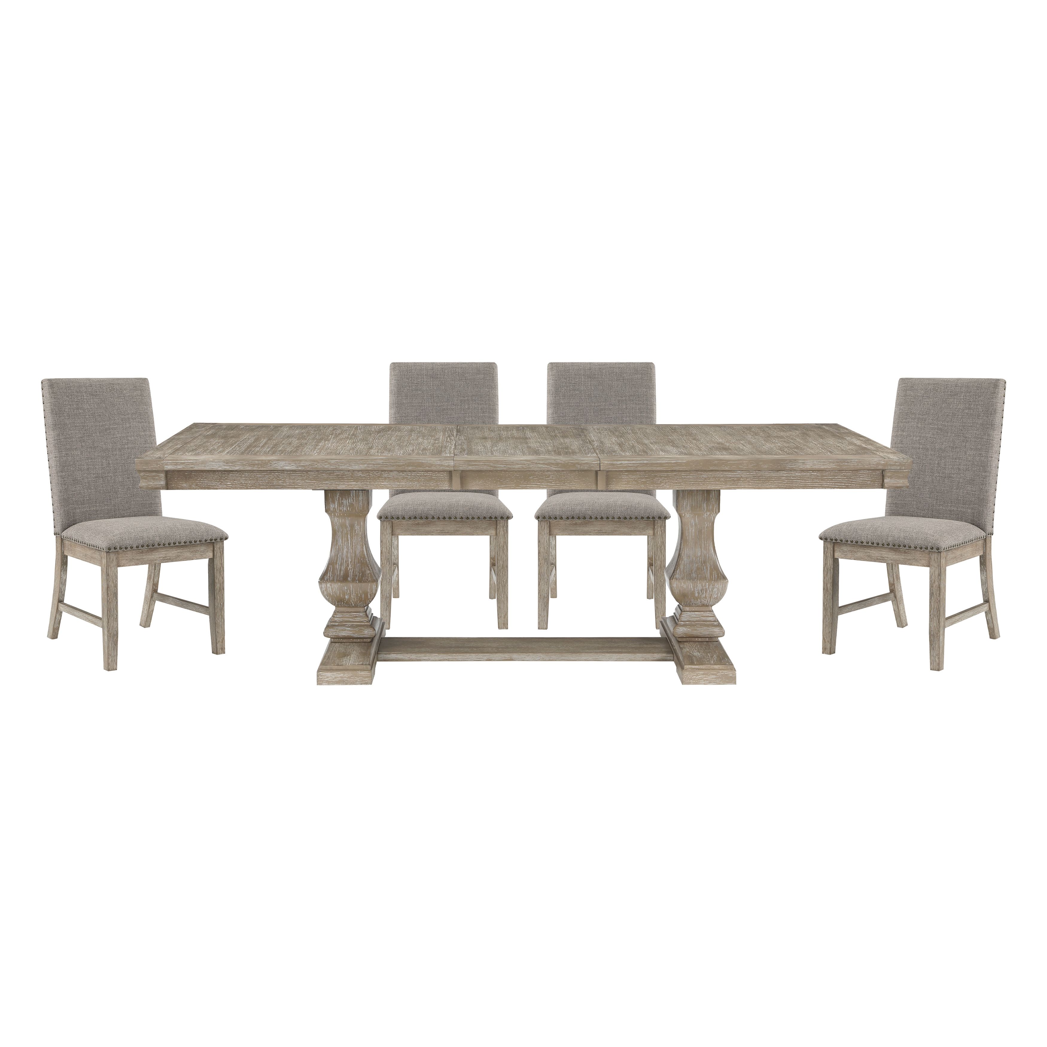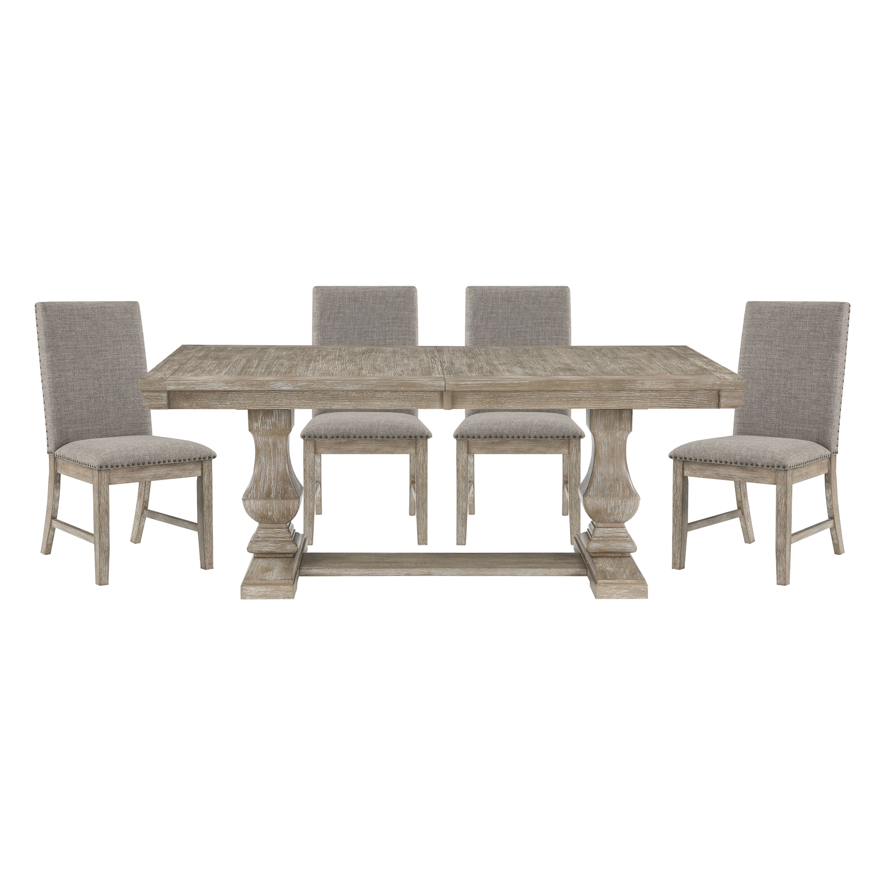 An elegant blend of traditional styling and rustic aesthetic combines to create the look of the Southlake Collection. The rectangular tabletop is supported by a double pedestal base, it's urn profile lending distinct accent to your dining room. The wire-brushed brownish-gray finish highlights the oak veneer and solid wood construction. The brown linen-covered seats and backs of the side chairs provide complementing contrast to the table. PRODUCT DIMENSIONS: DINING TABLE: 40" x 76.5" - 94.5" x 30.5"HApron to floor: 27"Length of leaf: 18" x 1SIDE CHAIRS: 20" x 25" x 39.5"HSeat Width: 20"Seat Depth: 17.5"Seat Height: 19.5"Listing Includes: 5pc Dining Set (1 Dining Table and 4 Side Chairs) Only.Simple Assembly Require.